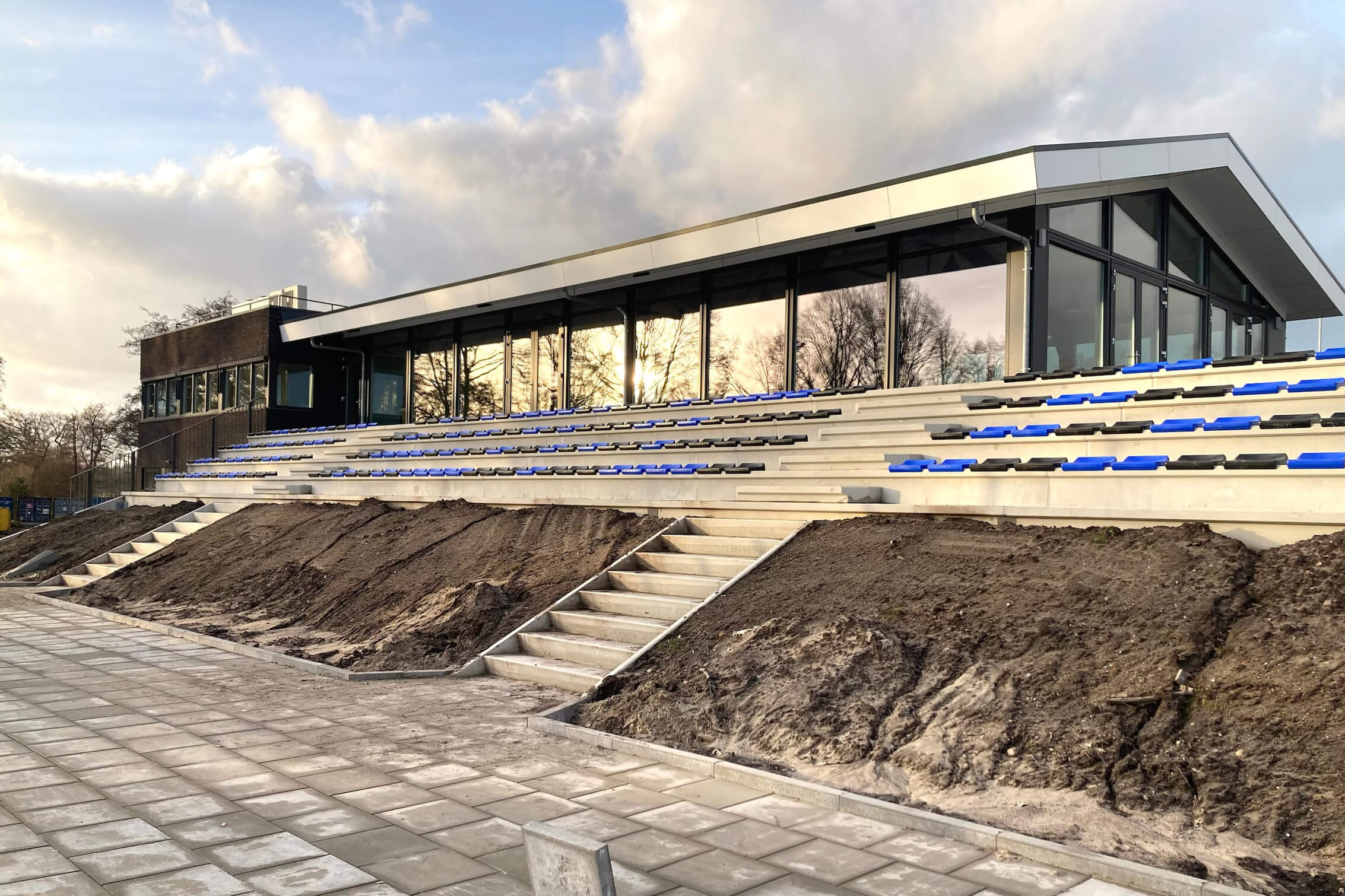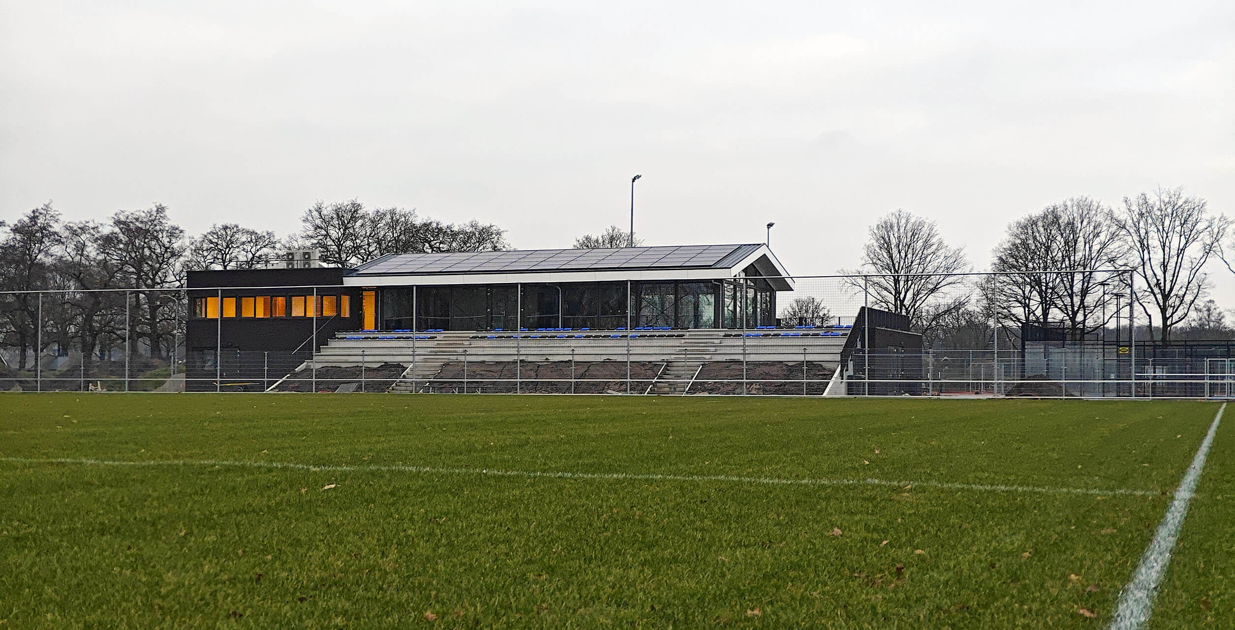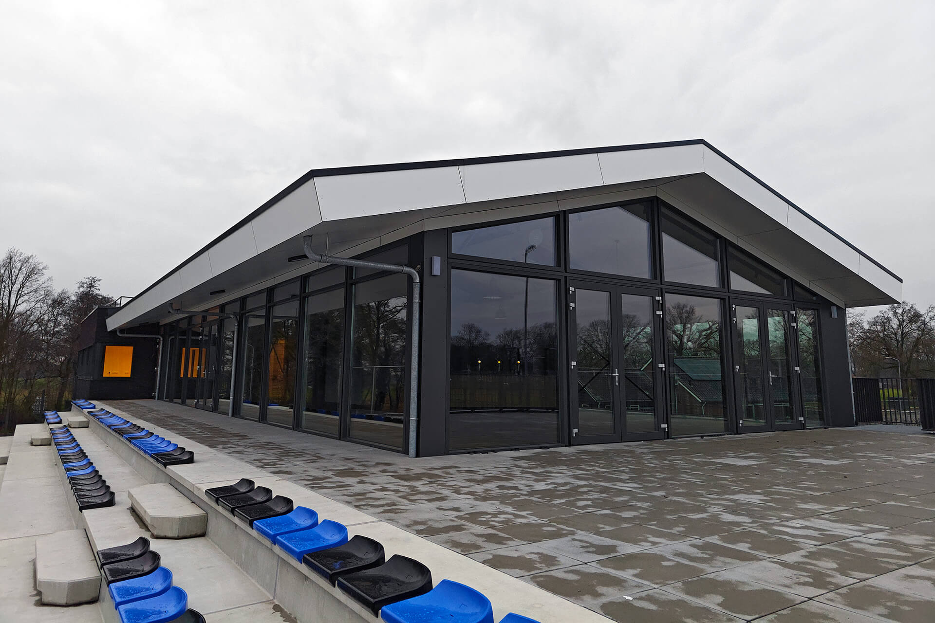 Om alles te kunnen herbergen, heeft het nieuwe clubgebouw twee verdiepingen. Beneden de kleedkamers en bergingen, boven bestuur- en commissiekamer en de kantine met veel glas vanwaar je zicht hebt over het gehele sportcomplex. Vanuit de kantine kunnen toeschouwers het terras op en zowel de voetbalvelden als de tennisbanen zien. Aan de zijde van het hoofdveld heeft het clubgebouw een tribune waar de blauw zwarte kleuren van de club zijn verwerkt in de tribunestoelen.