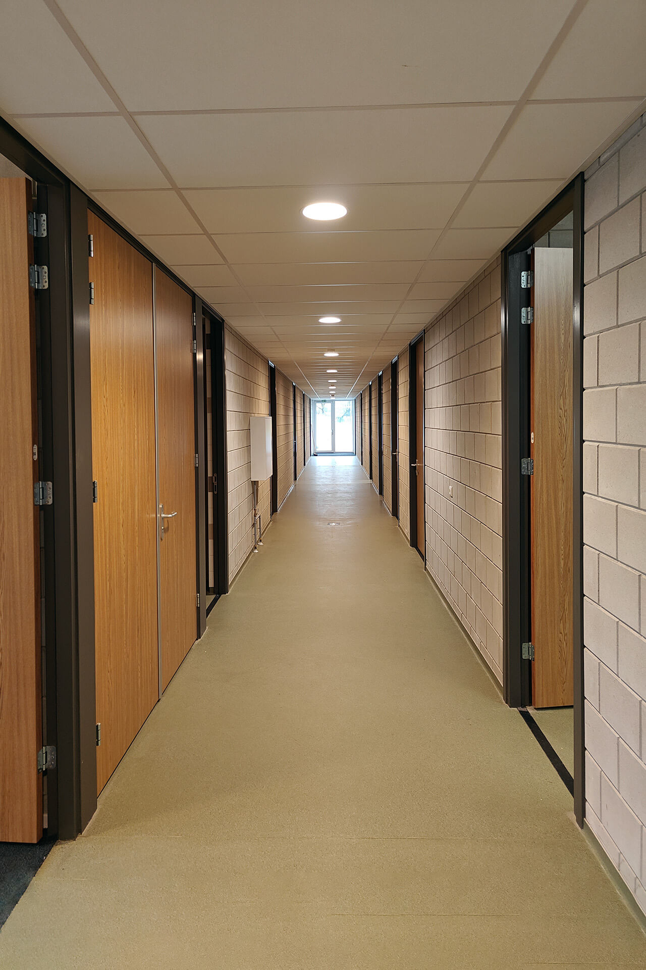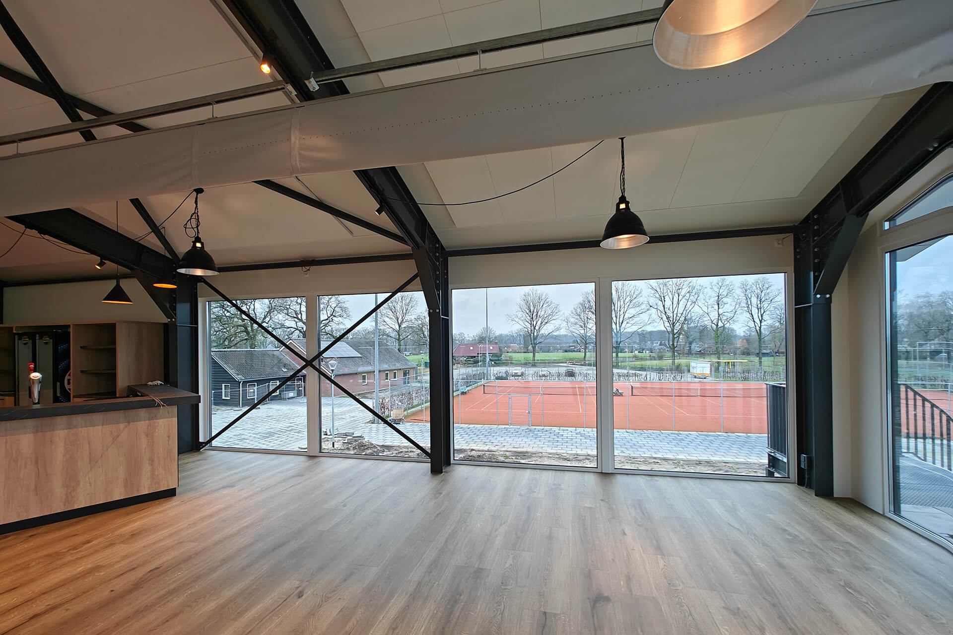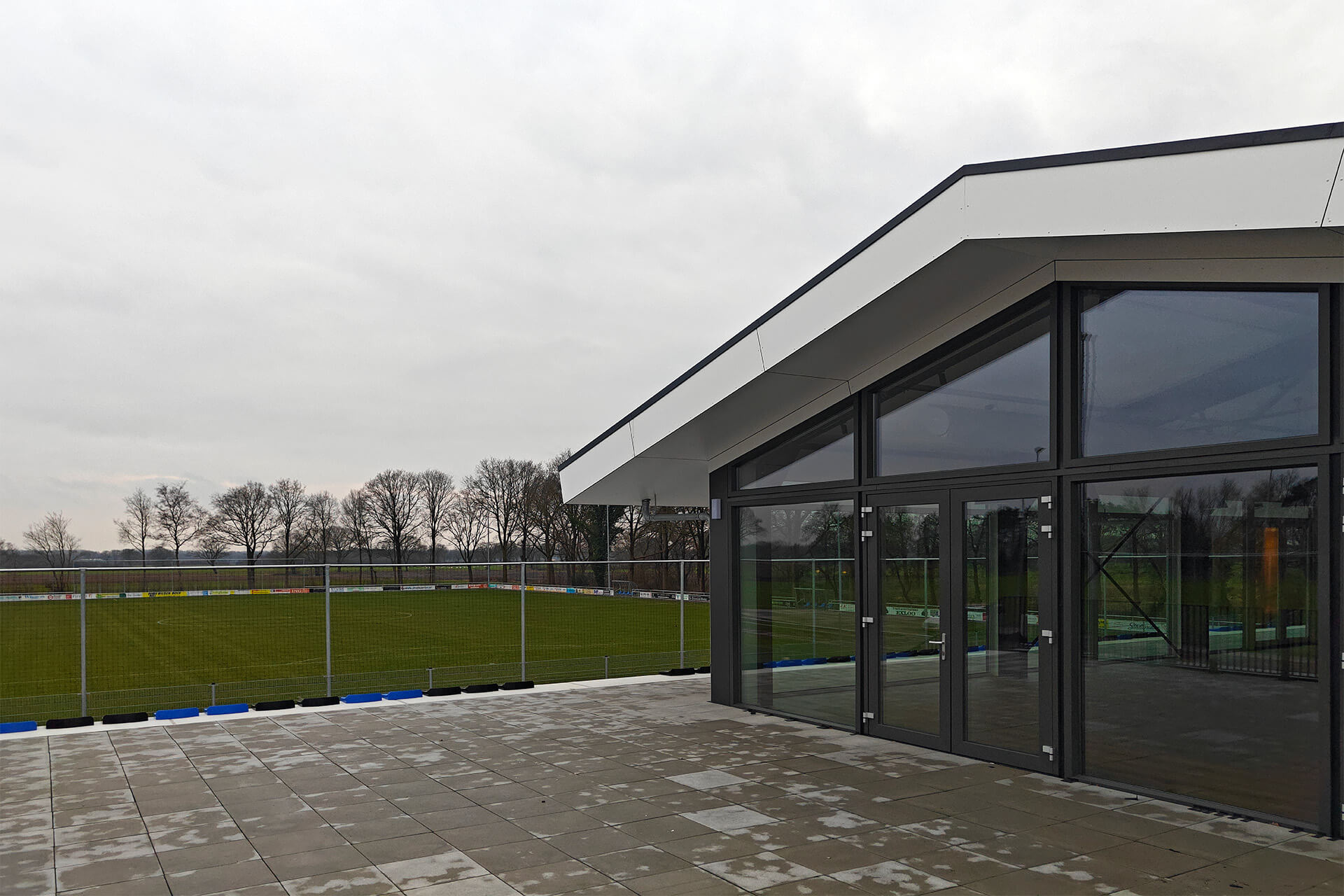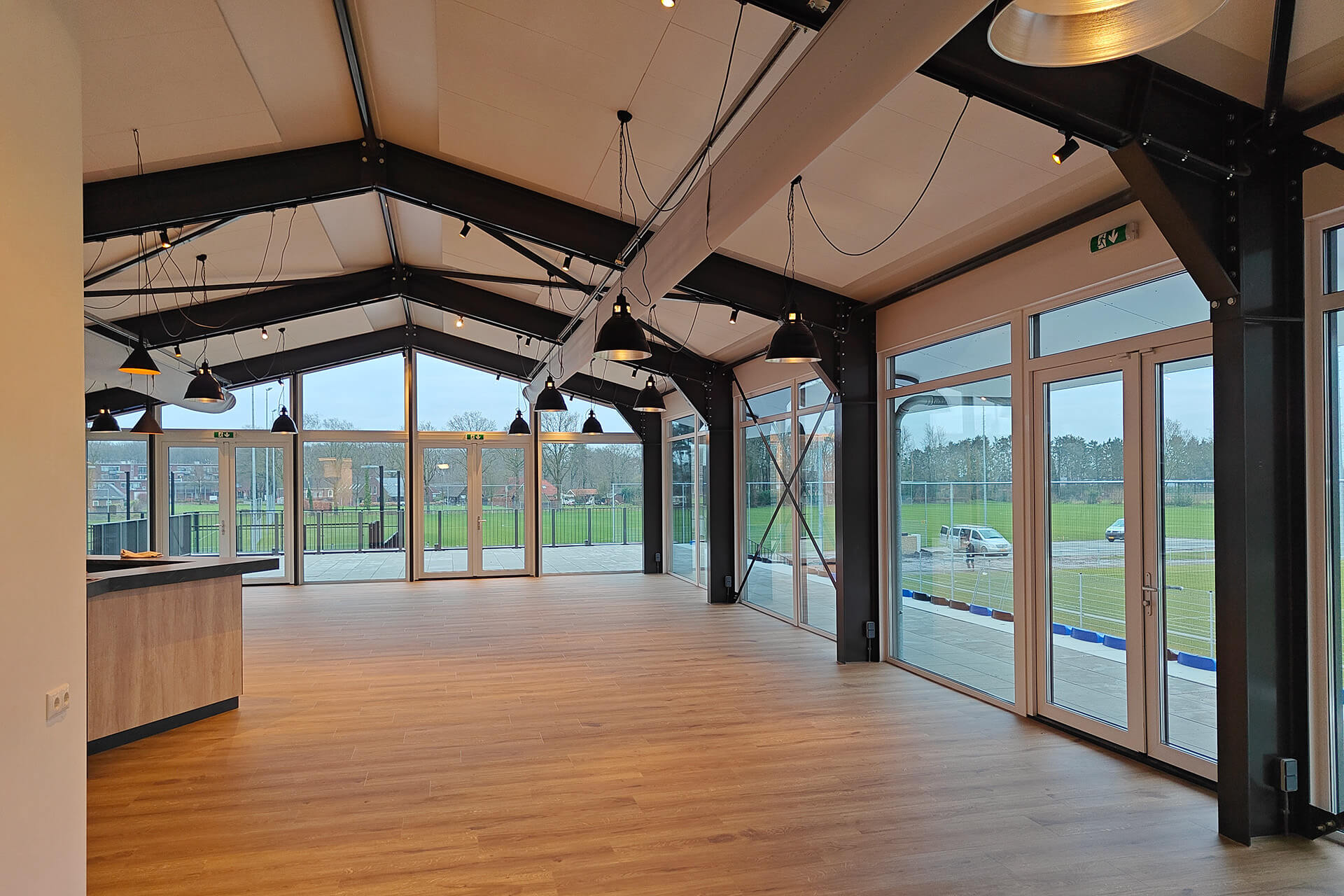 Om alles te kunnen herbergen, heeft het nieuwe clubgebouw twee verdiepingen. Beneden de kleedkamers en bergingen, boven bestuur- en commissiekamer en de kantine met veel glas vanwaar je zicht hebt over het gehele sportcomplex. Vanuit de kantine kunnen toeschouwers het terras op en zowel de voetbalvelden als de tennisbanen zien. Aan de zijde van het hoofdveld heeft het clubgebouw een tribune waar de blauw zwarte kleuren van de club zijn verwerkt in de tribunestoelen.