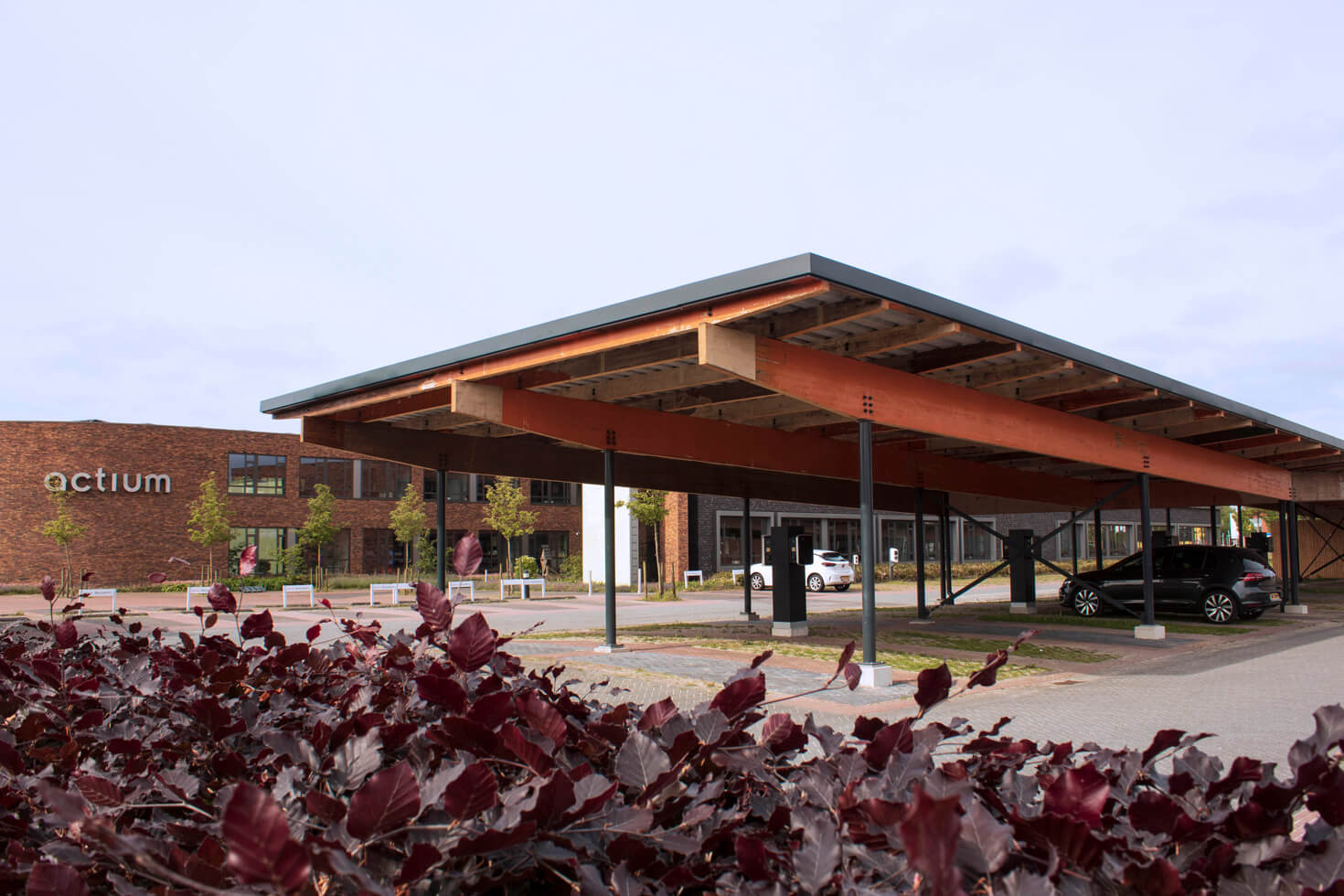 Woningbouwcorporatie Actium Wonen is met hun circulaire carport, ontworpen door HJK architecten, genomineerd voor de “Duurzame 30”, een verkiezing voor mensen en bedrijven met een hart voor duurzaamheid. Om medewerkers en bezoekers van Actium te stimuleren over te stappen naar elektrisch rijden is het gevleugelde dakvlak voorzien van 450 zonnepanelen waardoor de auto’s CO2 neutraal opgeladen kunnen worden. Door te ontwerpen met hergebruikte houten spanten wordt de CO2 voetafdruk van de zonnecarport verder teruggebracht.