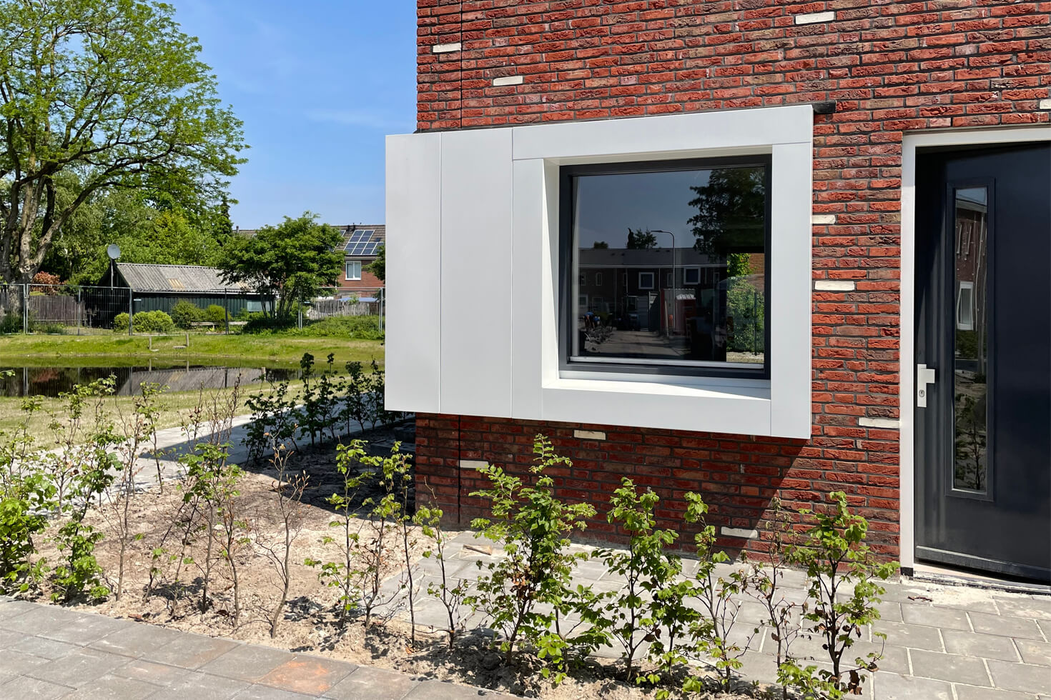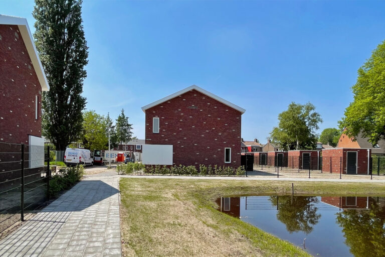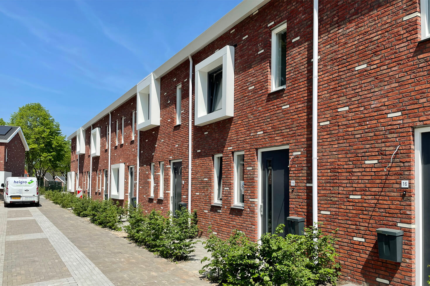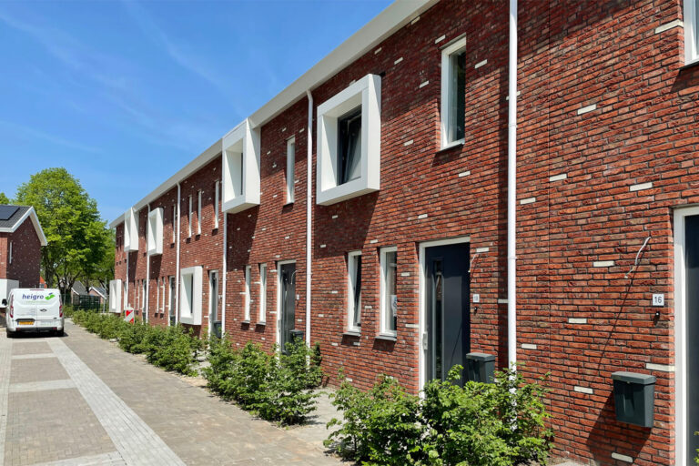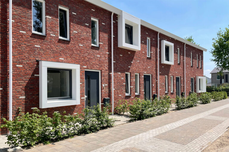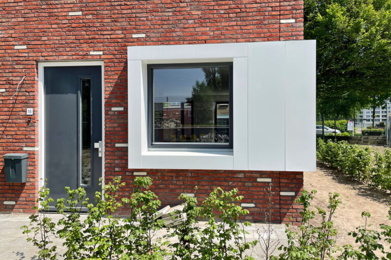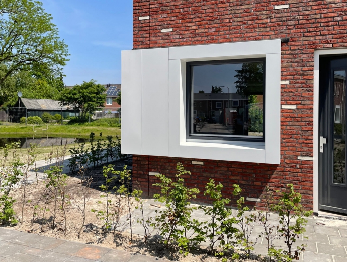 Door een rode baksteen toe te passen wordt aansluiting gezocht bij de rest van de wijk en de witte strooisteen complementeert de witte vensters en daklijsten. De overhoekse goot en de windveren hebben dezelfde strakke uitstraling en materialisering als de vensters, waardoor er een rustig geheel ontstaat.