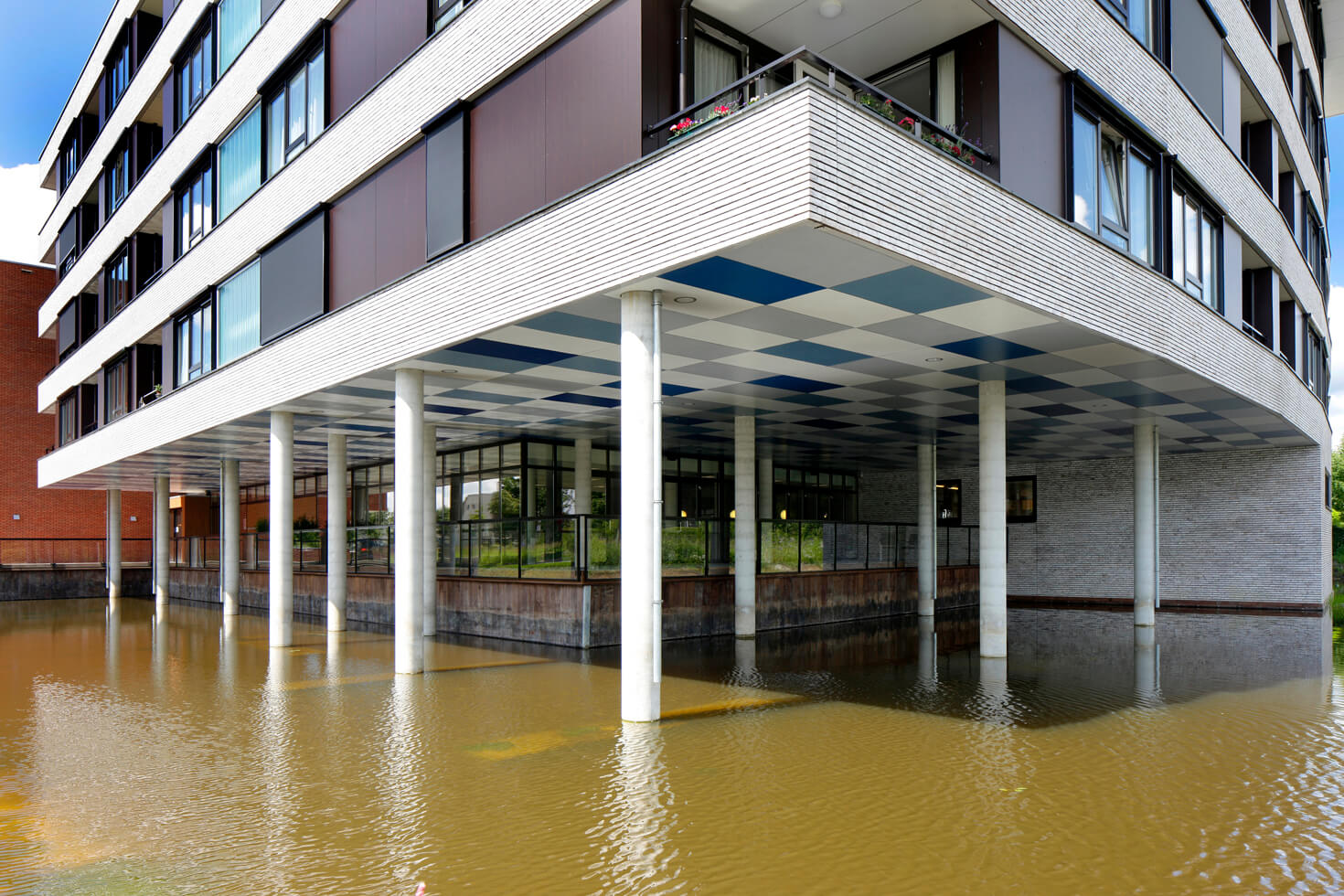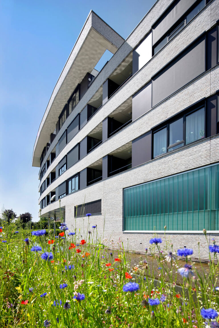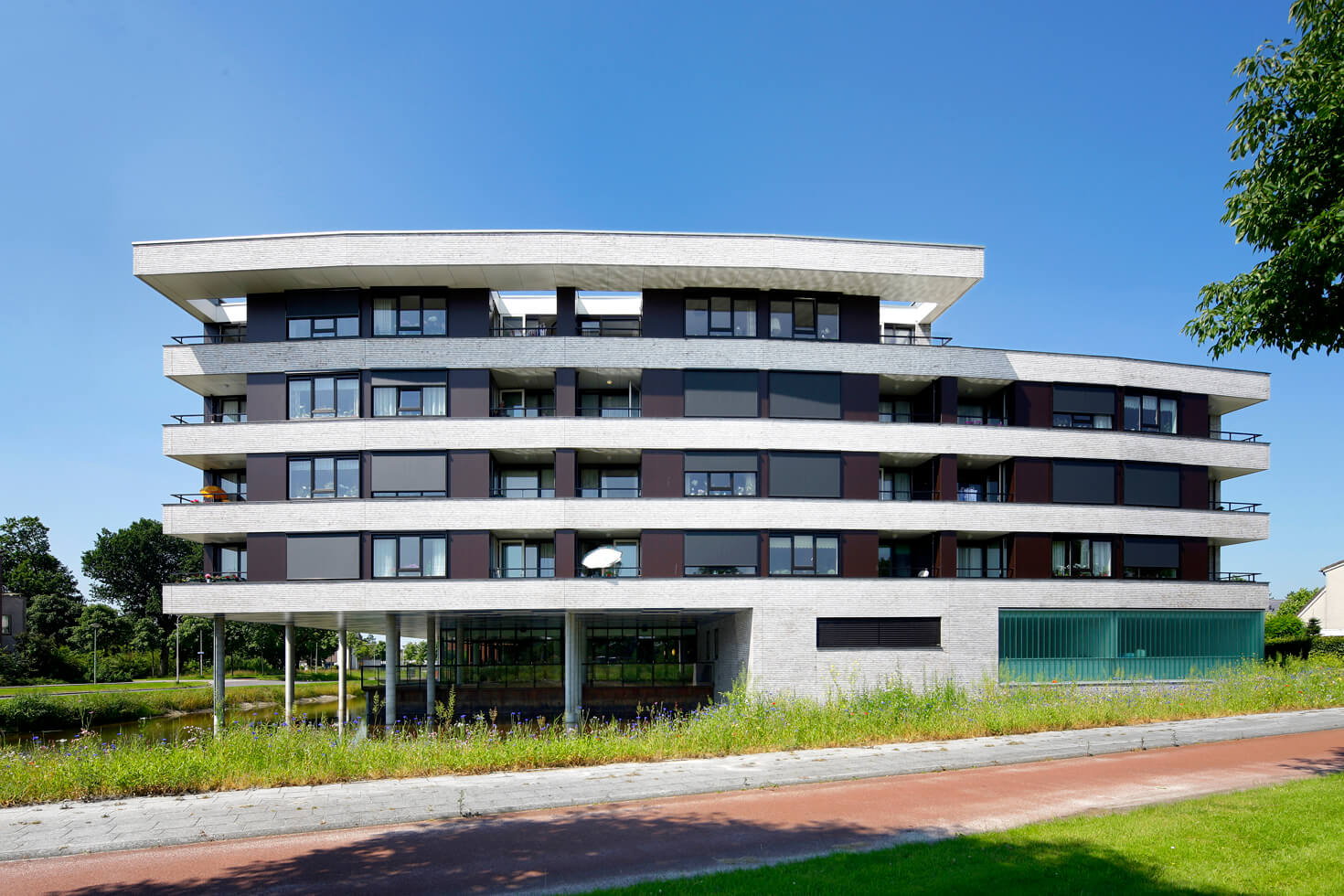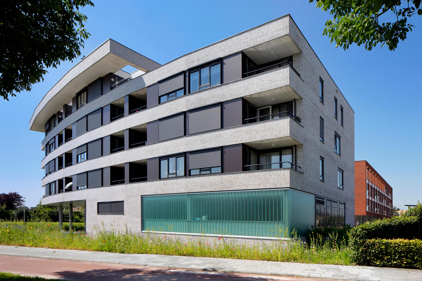 De aanleunwoningen bevinden zich in de kop van het gebouw, zwevend boven de waterberging van de wijk. Verrassend is het plafond van de witte kop boven het water. De kop is horizontaal vormgegeven door de witte metselwerk banden die stootvoegloos gemetseld zijn. De zorgappartementen hebben als contrast een verticale gevelindeling met smalle oranjekleurige stenen penanten met een diepe negge.