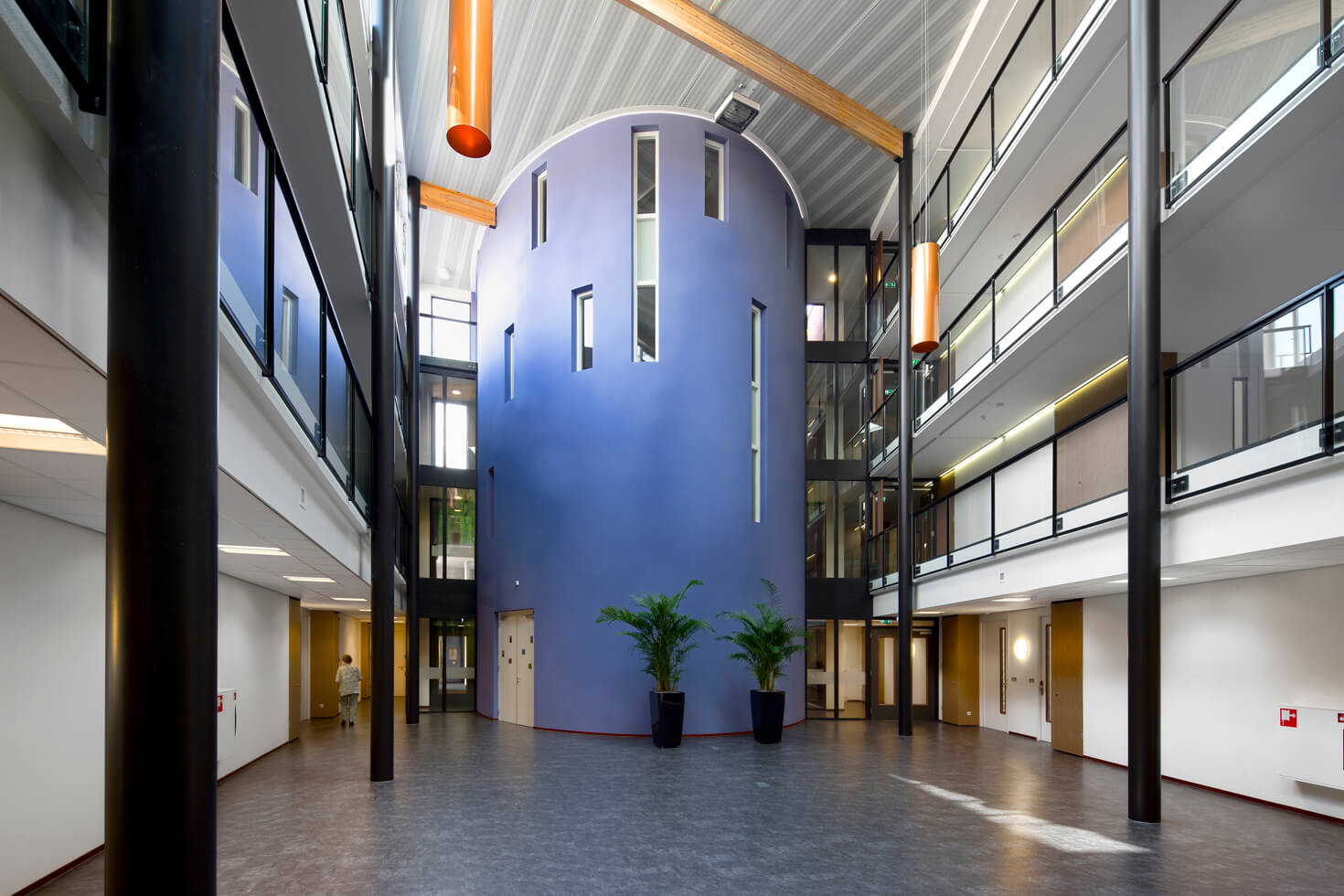 Tussen deze orthogonale bouwmassa’s zijn ronde volumes geplaatst van stucwerk in verschillende blauwe kleuren waarin de stijgpunten en de facilitaire functies zich bevinden. Elk volume is af en heeft zijn eigen plek en functie. Deze volumes worden geschakeld door open ruimtes variërend in hoogte. Dit heeft zowel binnen als buiten een spannende belevenis.