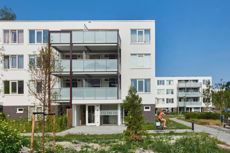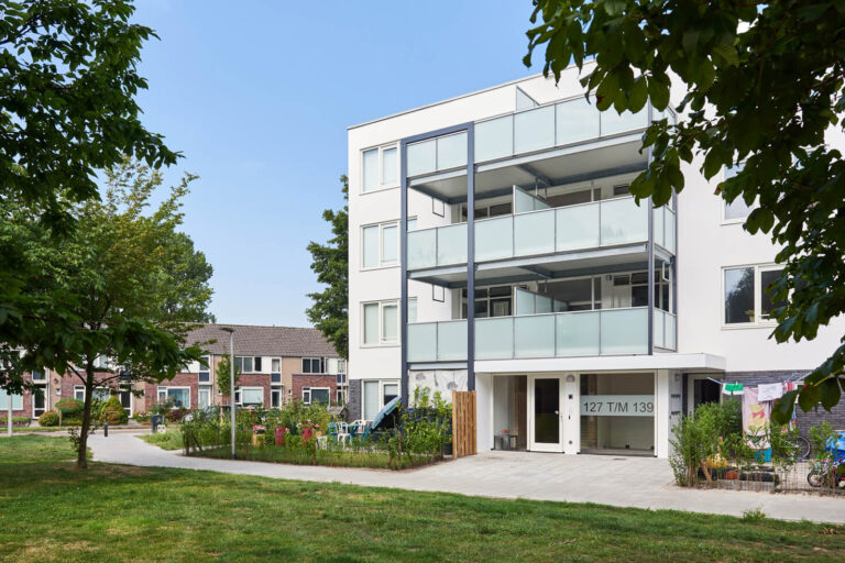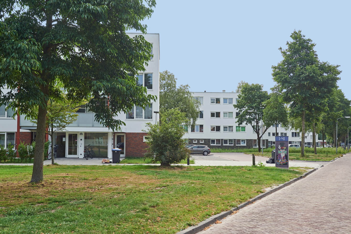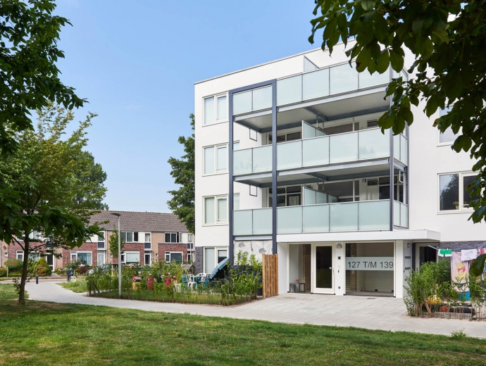 Een nieuwe entree sluit de portieken af, een luifel vergroot het comfort. De directe ontsluiting van het bergingenblok maakt de verkeerstromen in de portiek meer helder. Je zet je fiets in de berging, neemt de post uit de brievenbus en gaat naar je woning. De aanduiding van de huisnummers op het glas van de pui maakt van grote afstand duidelijk in welke portiek je moet zijn.