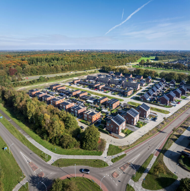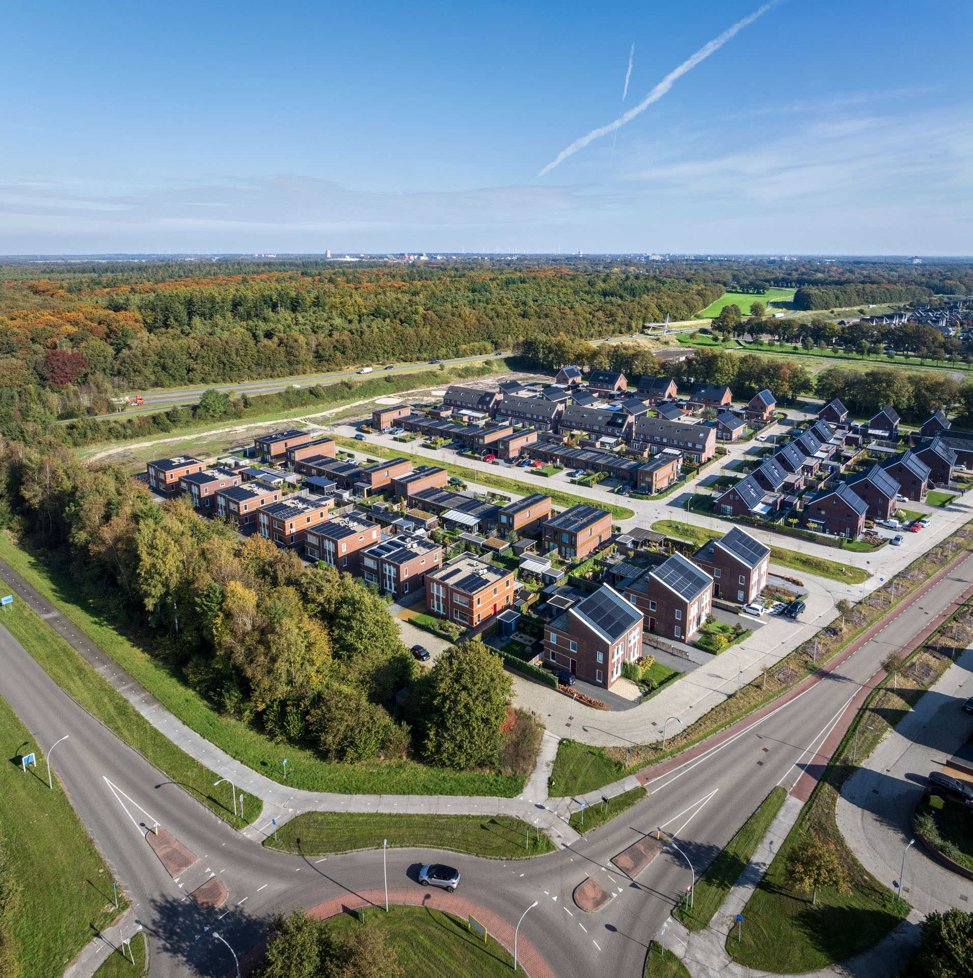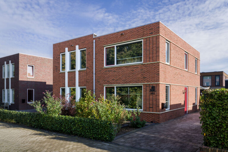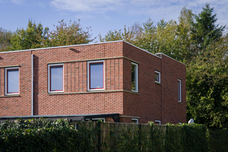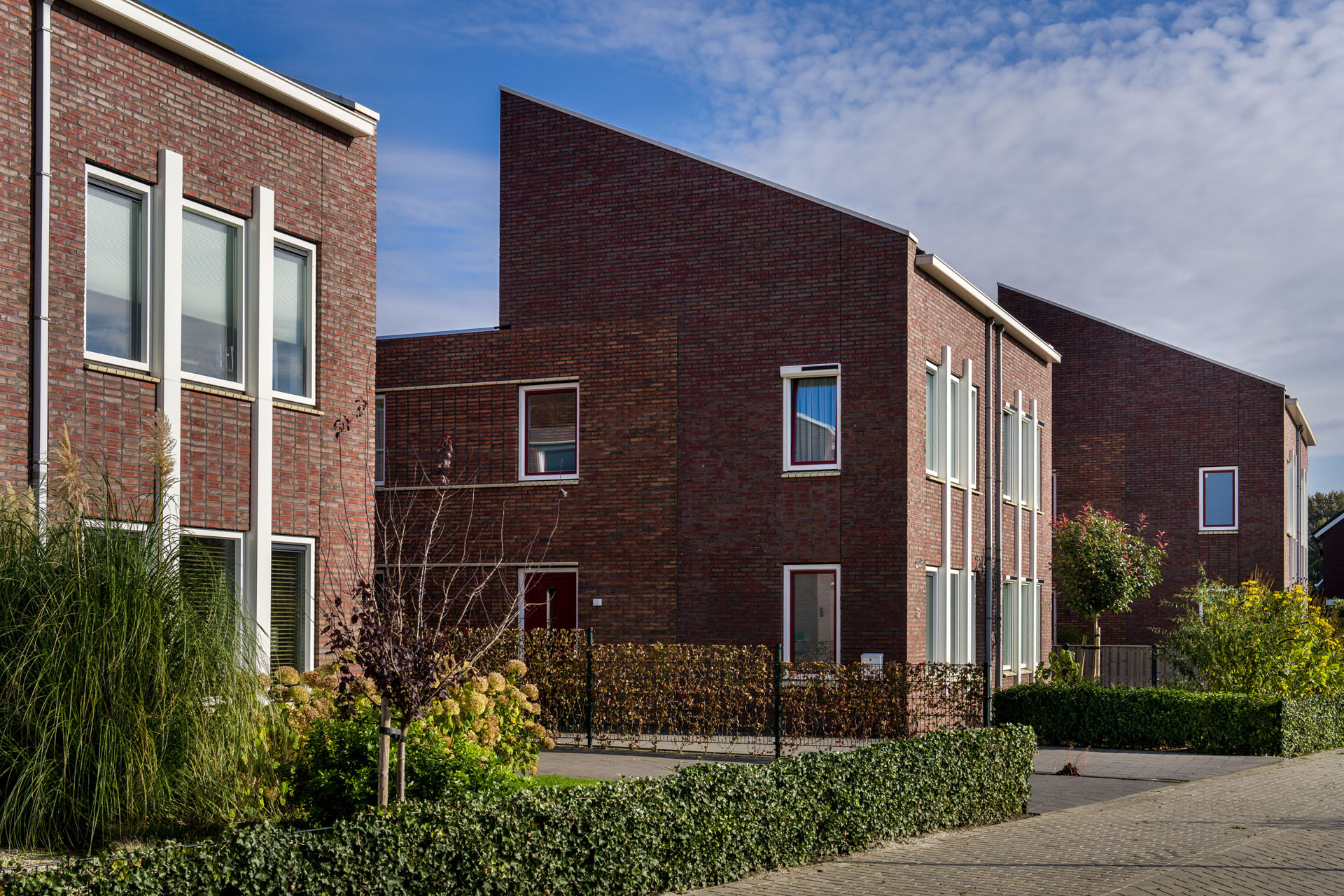 Langs de Oude Delft staan drie volumes met een lessenaar dak die de entree vormen van de wijk. Deze zichtlocatie vroeg om een woning met een groter volume en uitstraling. Aan de Eikenwal hebben de woningen een plat dak en is er gevarieerd in dak hoogte en met baksteen kleuren in verschillende tinten rood.