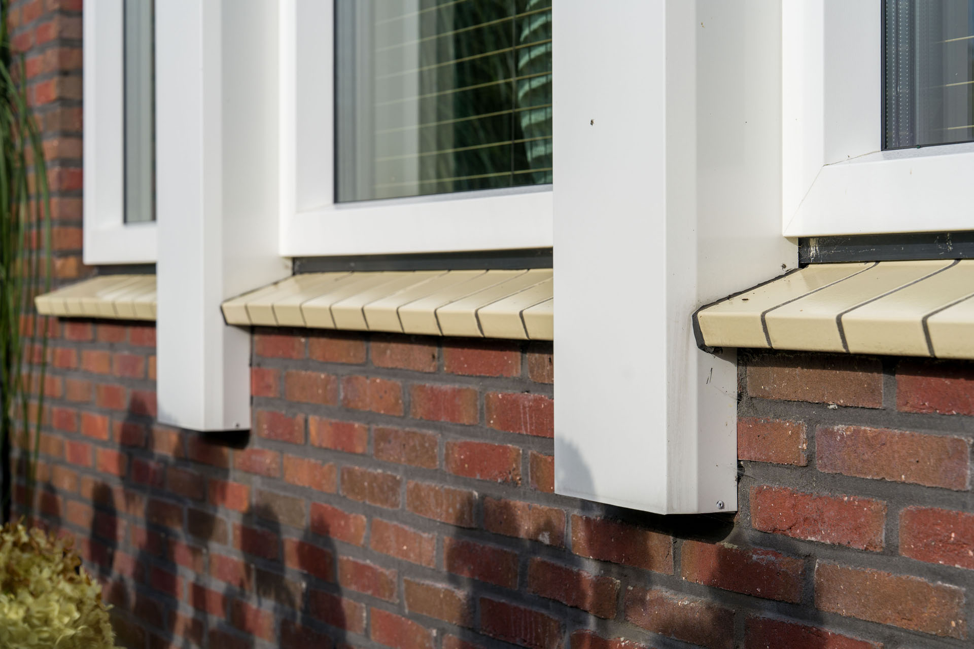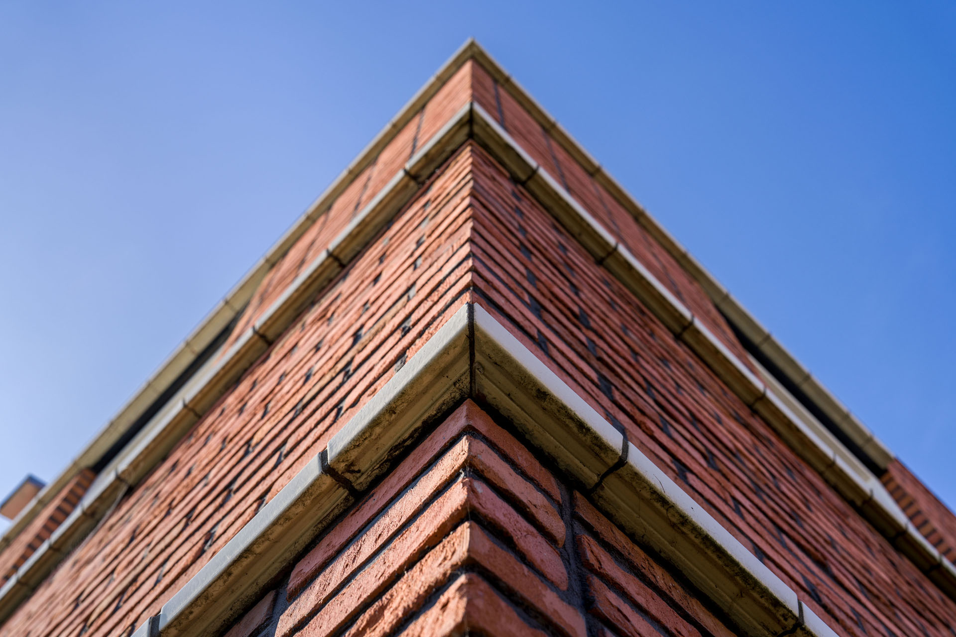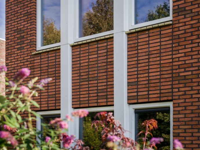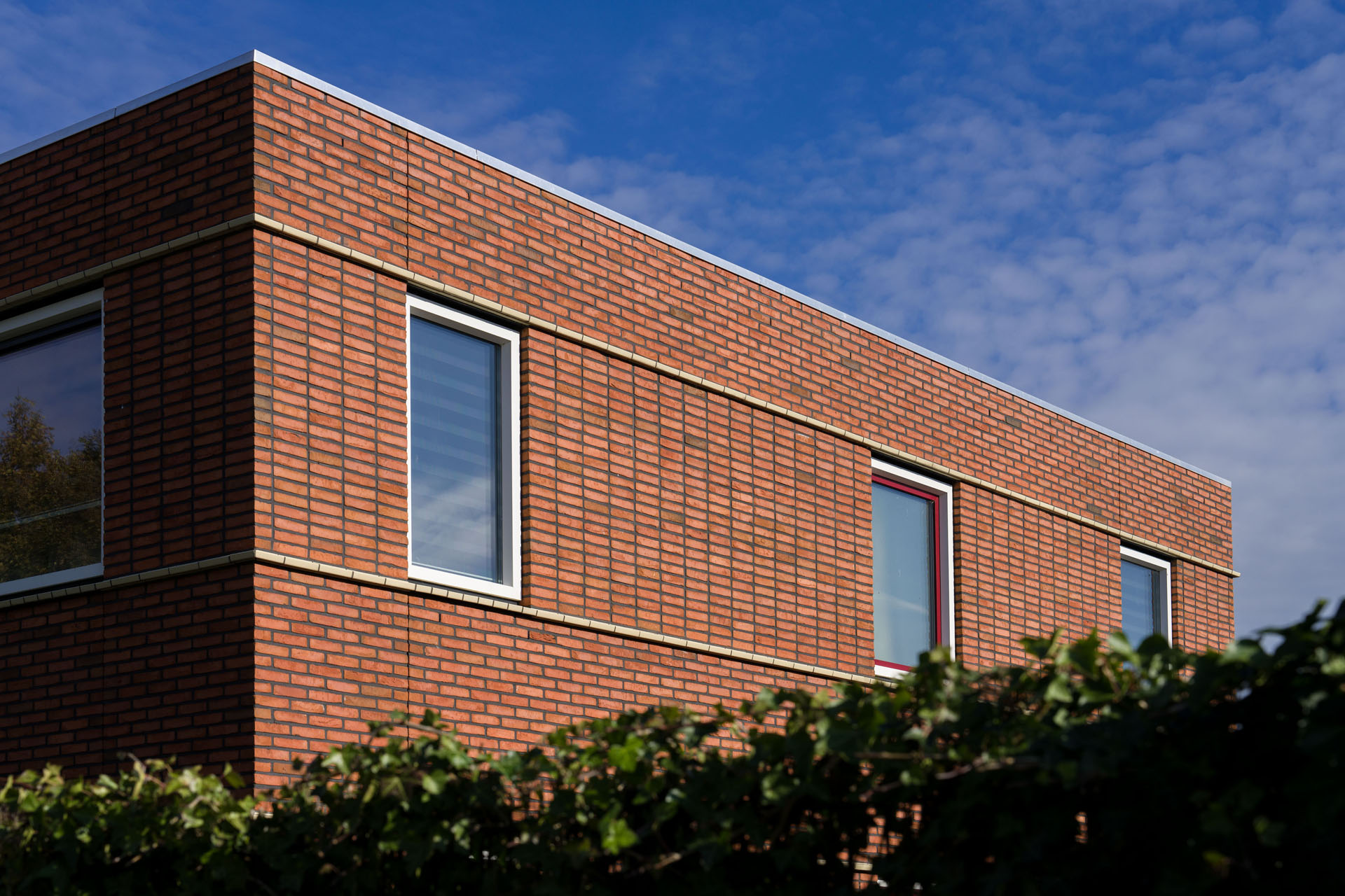 De afwisseling wordt versterkt door het gebruik van dezelfde zetwerk banden. De horizontale accenten zijn gemaakt met siermetselwerk in tegelverband, omkaderd met raamdorpelstenen die het horizontale karakter versterken.