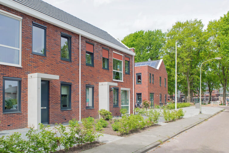 Aan de straatzijde vallen de betonnen luifels rondom de entree direct op, deze versterken samen met de grote raampartijen per woning de telbaarheid van het gebouw. De telbaarheid versterkt de uitstraling van grondgebonden woningen nog meer. Achter de 2 volumes is een binnenterrein met veel groen waar alle appartementen hun buitenruimte aan hebben.
