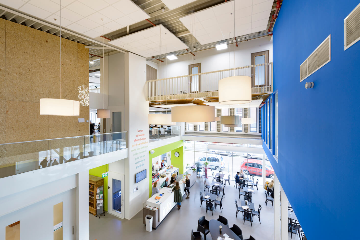 Eenmaal binnen heb je een goed beeld van de voorzieningen die worden geboden, de vide koppelt de beide verdiepingen en geeft een gevoel van overzicht en veiligheid. Je ziet de hulpverlener die je zocht of je buurman, je drinkt een kopje koffie in het restaurant of een biertje op het terras.