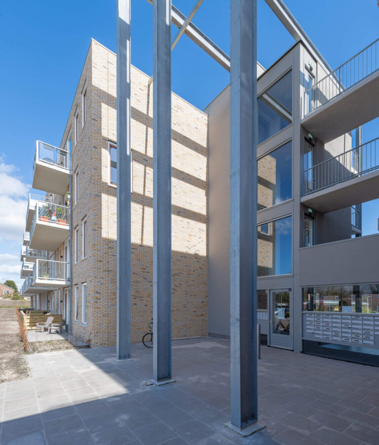 De appartementen zijn verdeeld over 2 bouwblokken van 4 bouwlagen. De bouwblokken vormen een haak met in de oksel daarvan de entree naar beide vleugels. Dit entreegebied wordt benadrukt met een stelsel van thermisch verzinkte stalen portalen, de route ernaar toe wordt ingezet door de lagere bebouwing van het bergingenblok. Het zachtgele metselwerk van het complex wordt op deze plek onderbroken door een baan van lichter metselwerk, die de achtergrond vormt voor de naam van het complex. De stenen zijn een mix van een zachte kleur gele gevelstenen (wasserstrich) en witte gevelstenen(handvorm) met kolensintering van Aberson.