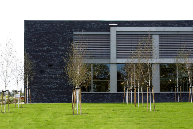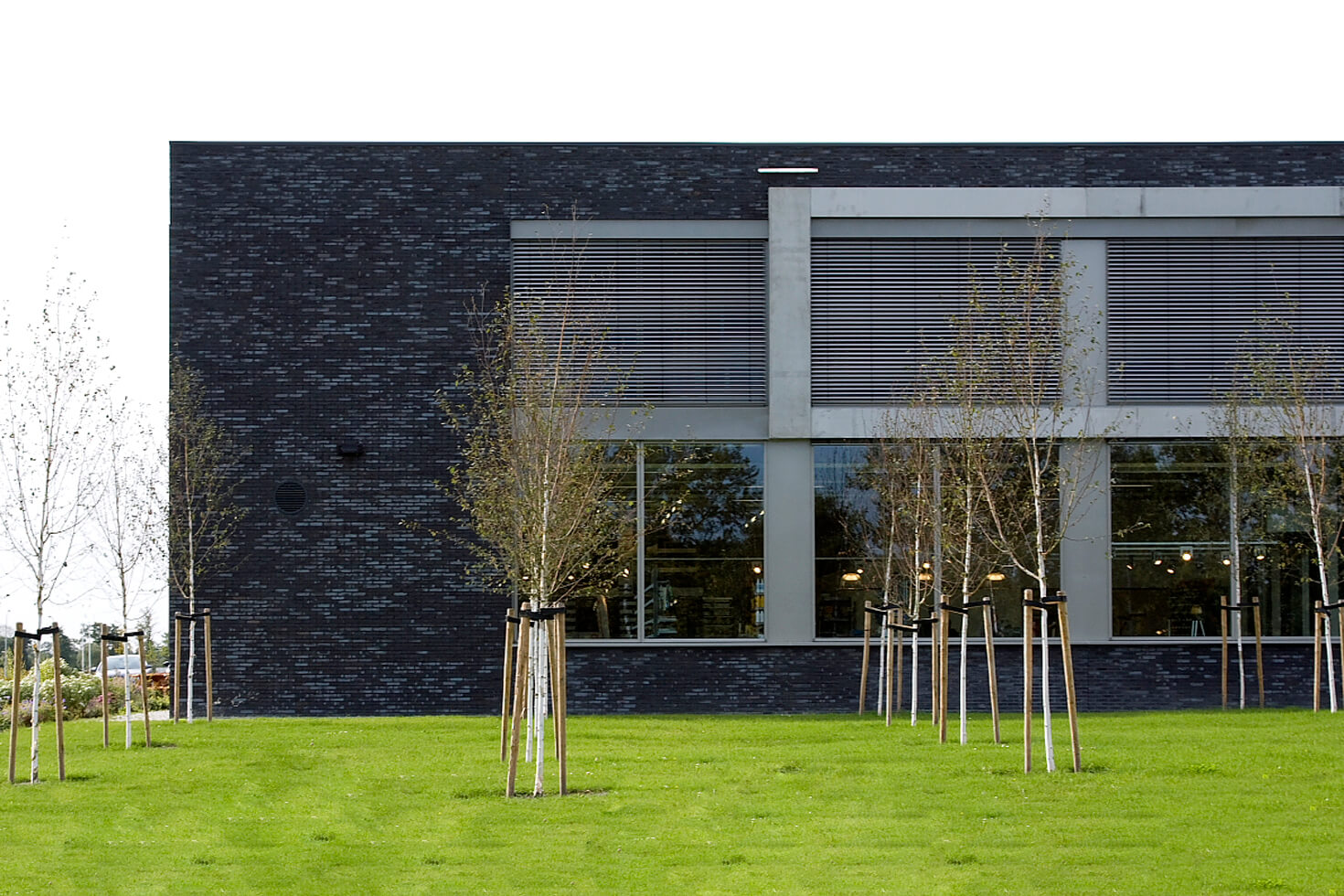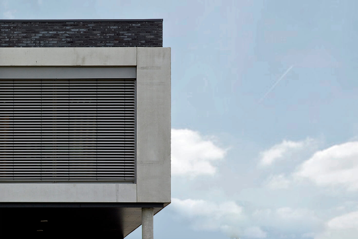 Het gebouw is opgezet als een staalconstructie met betonnen vloeren en dak. De binnenschil is van kalkzandsteen en de buitenschil van zwarte baksteen met accenten van prefabbeton. De warm grijze aluminium puien zijn maximaal gedimensioneerd en wanneer je hier werkt geniet je van een prachtig uitzicht op de snelweg en de landerijen.