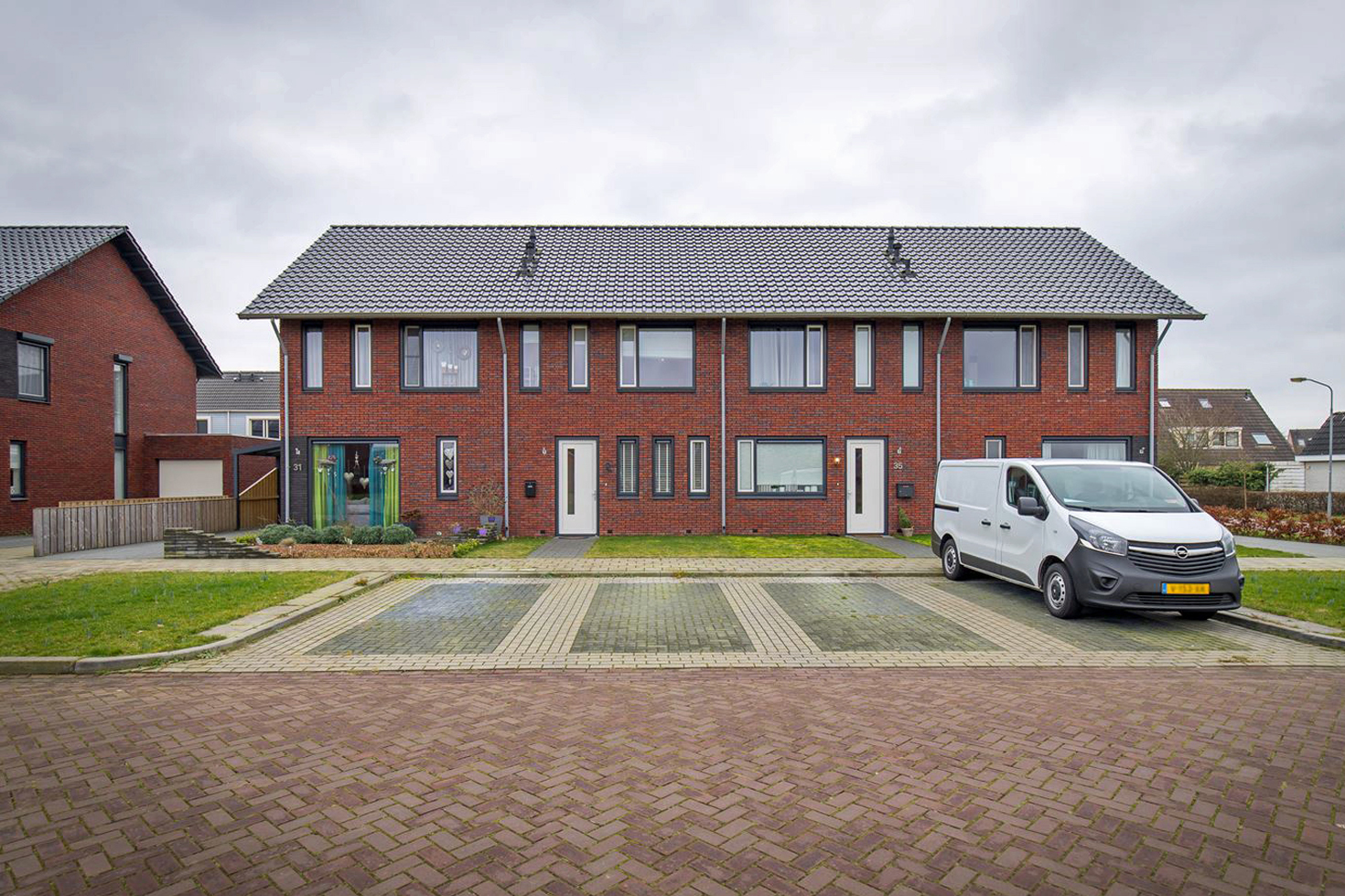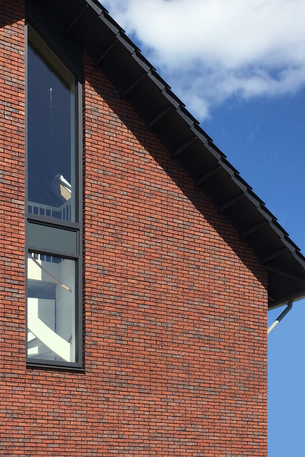 Wat direct opvalt aan het ontwerp is het grote dakvlak. Het extra grote dakoverstek zorgt dat het dakvlak dominant aanwezig is bij de woningen. Voor de verdieping werkt het grote dakoverstek ook als een gedeeltelijke zonwering. Qua detaillering is het dakoverstek fijn uitgevoerd, de dunne detaillering met klossen en een zinken mastgoot maken het dakvlak af.