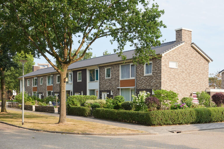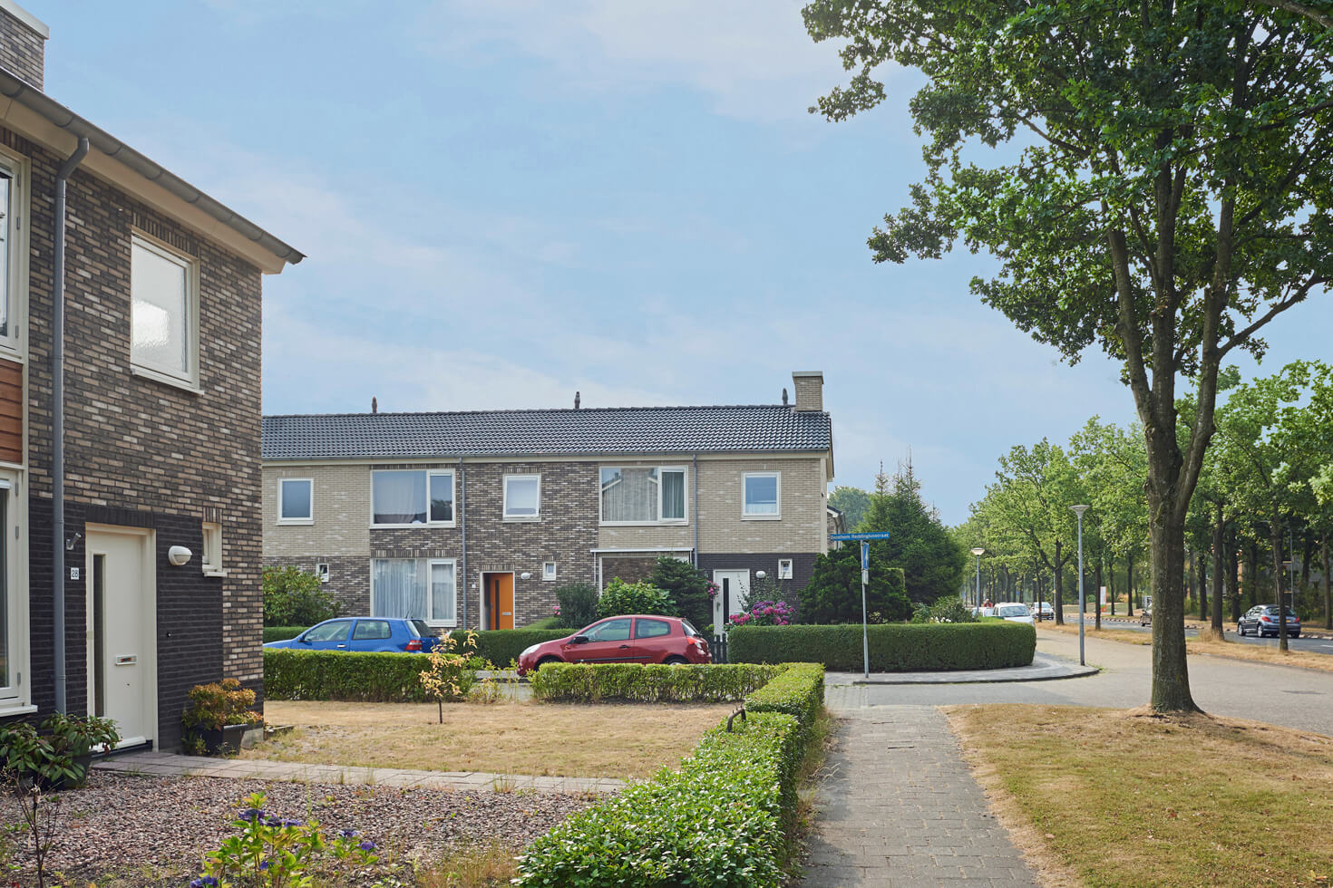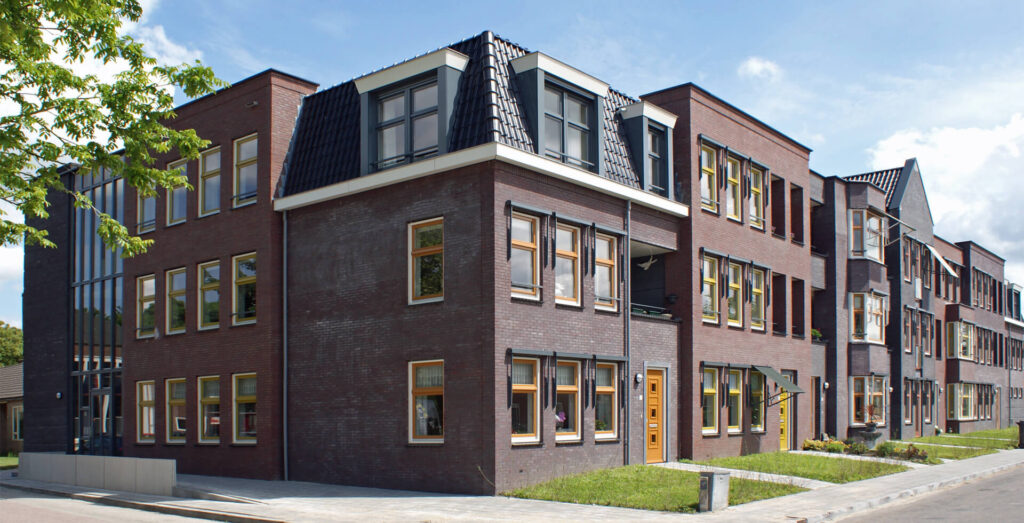 De woningen hebben een nieuwe jas met een eigentijdse uitstraling. De Maria in Campislaan is vrij breed en gericht op de snelheid van de doorgaande weg. Aan deze straat hebben de lange blokken op diverse plekken verticale accenten van een wit aluminium kader rondom de raampartij.