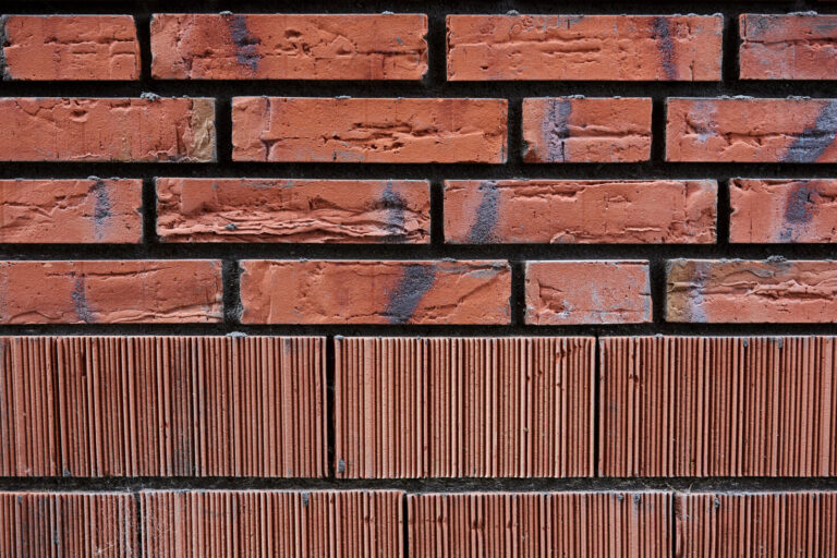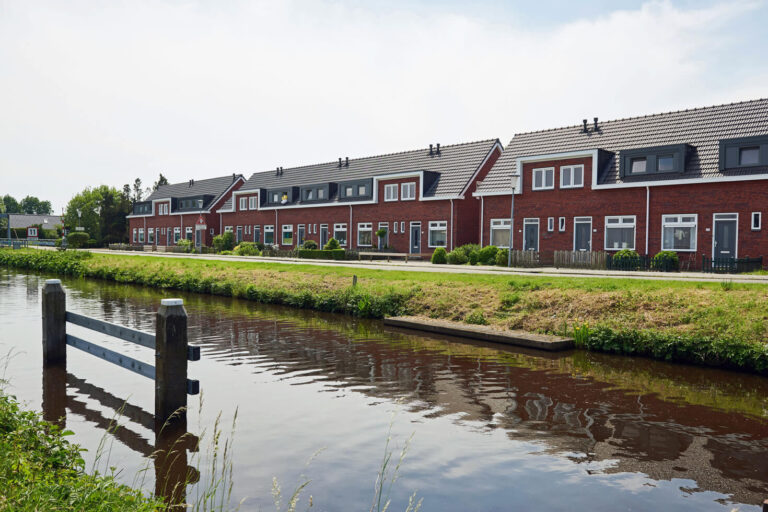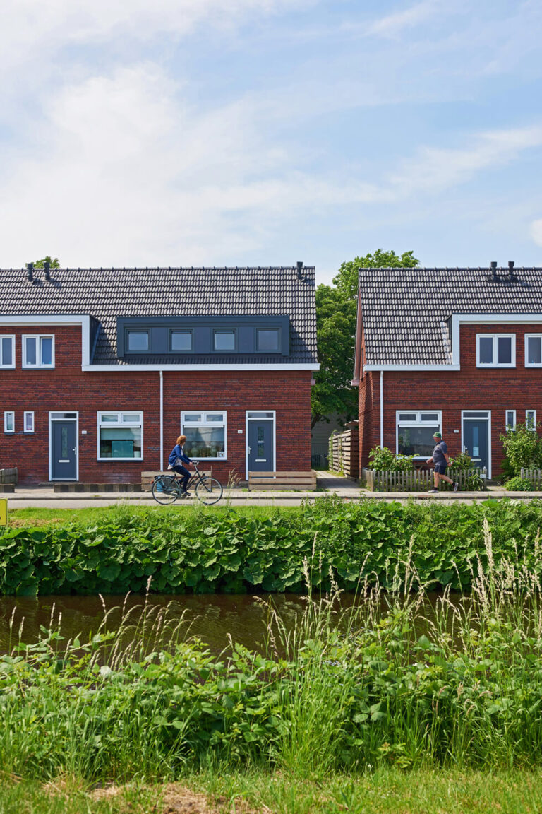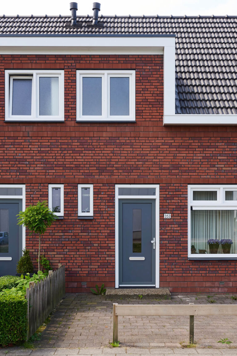 De buitengevel is opnieuw gemetseld met een steen die maar zeven centimeter dik is, waardoor er ruimte was voor meer isolatie in de spouw. Dit formaat noemt steenfabriek Strating “Dinkeltje”. De kozijnen zijn vervangen en er is een nieuwe geïsoleerde kap op de blokken gekomen. Dakkapellen zijn vergroot en bescheidener gekleurd. Het zinkgrijs van de nieuwe dakpannen is overgenomen. De nieuwe aluminium goten gaan over in de afwerking van de opgaande voorgevels, versterken de afwijkingen en zorgen voor ritmiek.