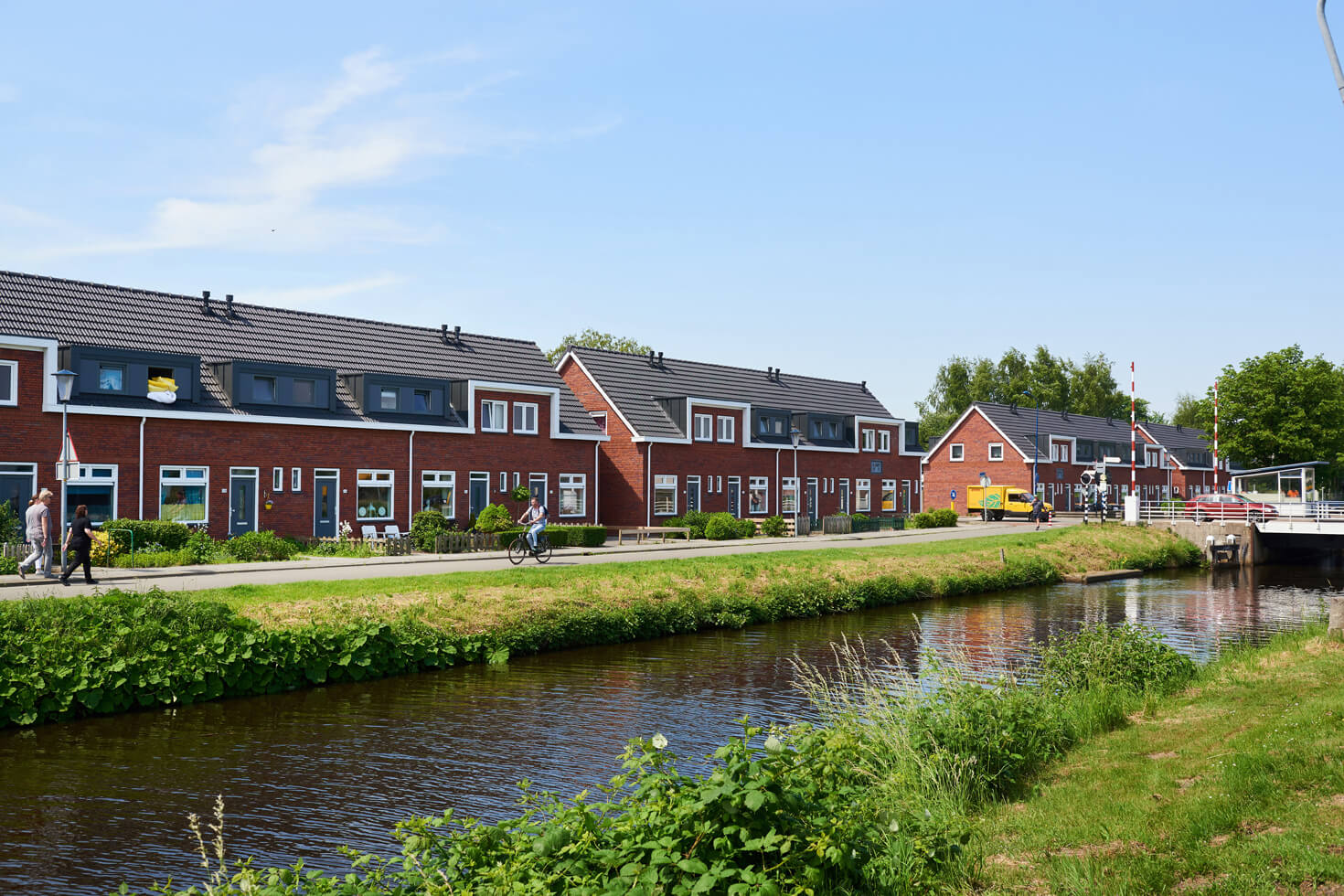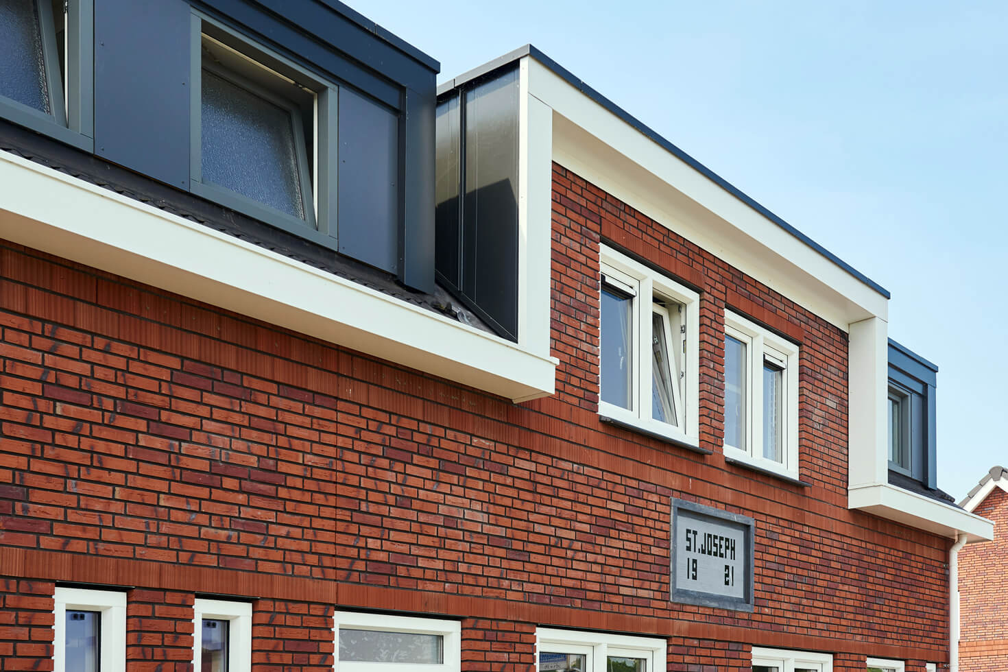 De buitengevel is opnieuw gemetseld met een steen die maar zeven centimeter dik is, waardoor er ruimte was voor meer isolatie in de spouw. Dit formaat noemt steenfabriek Strating “Dinkeltje”. De kozijnen zijn vervangen en er is een nieuwe geïsoleerde kap op de blokken gekomen. Dakkapellen zijn vergroot en bescheidener gekleurd. Het zinkgrijs van de nieuwe dakpannen is overgenomen. De nieuwe aluminium goten gaan over in de afwerking van de opgaande voorgevels, versterken de afwijkingen en zorgen voor ritmiek.