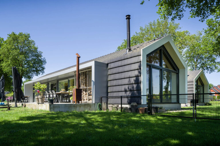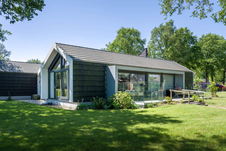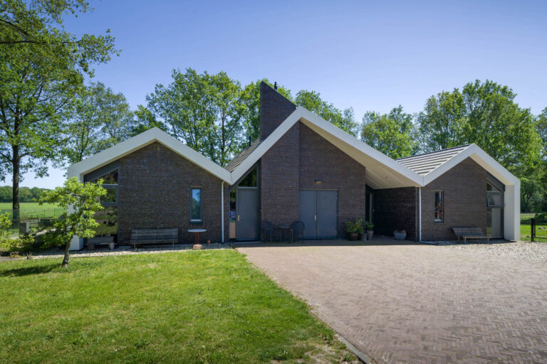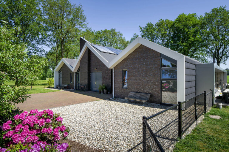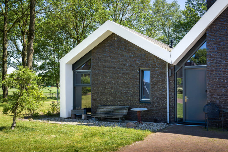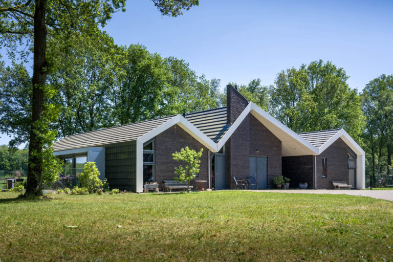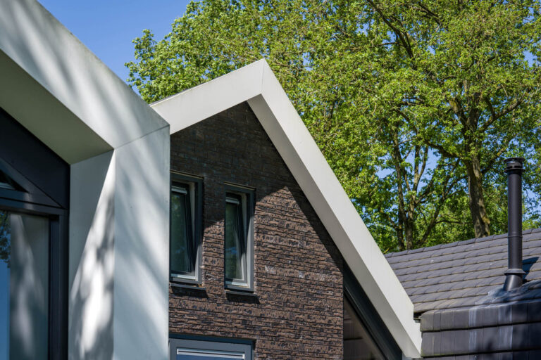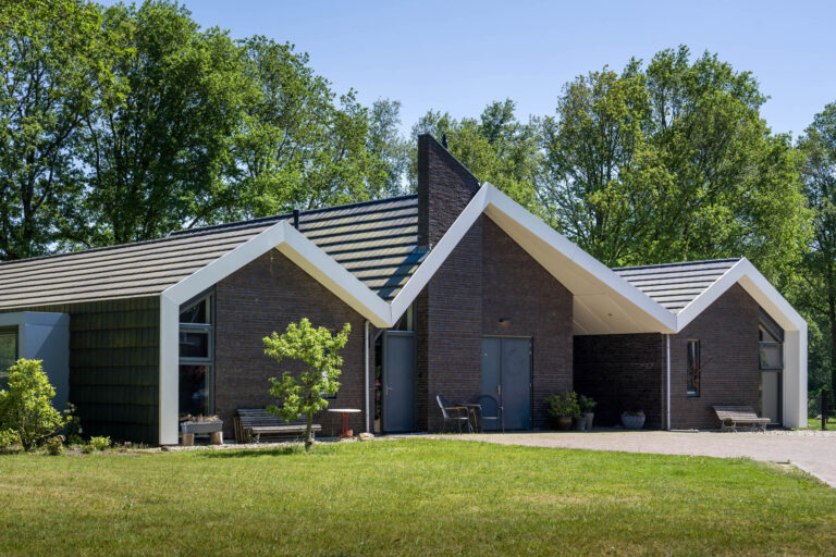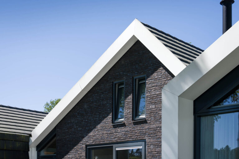 De antraciet vlakke pan geeft het gebouw een rustige landelijke uitstraling. De uit het bestemmingsplan verplichte witte kaders geven het gebouw energie die versterkt wordt door het schoorsteen element. Dichterbij krijgt de voorgevel meer reliëf en wordt het tastbaarder door de ruige antraciet boomschorssteen van Strating, die stootvoegloos gemetseld is in verschillende formaten.