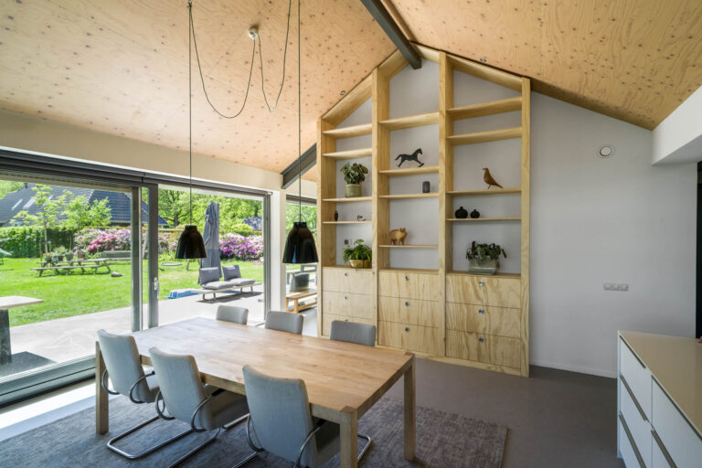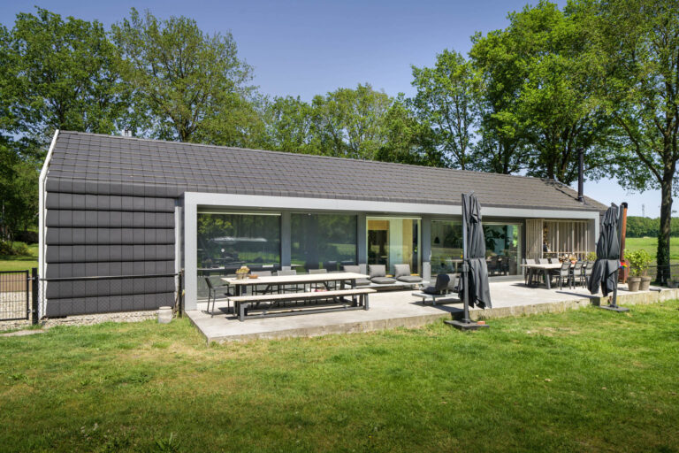De woning is omgeven door grasland en er is optimaal gebruik gemaakt van het aanwezige hoogteverschil in het terrein. Het grootte betonnen terras is hierdoor een toegevoegde kamer van de woning, waar binnen en buiten in elkaar overlopen.