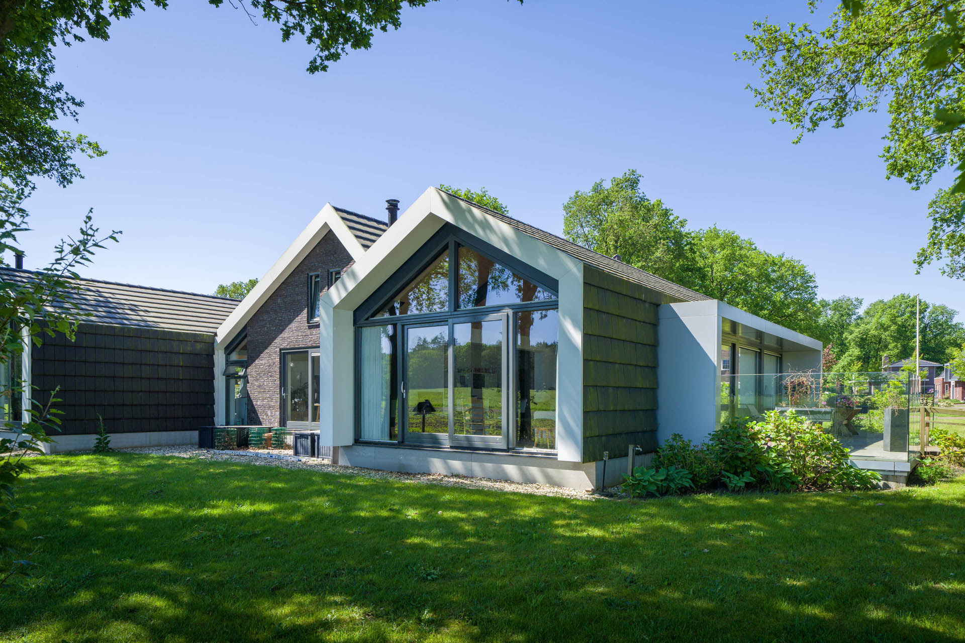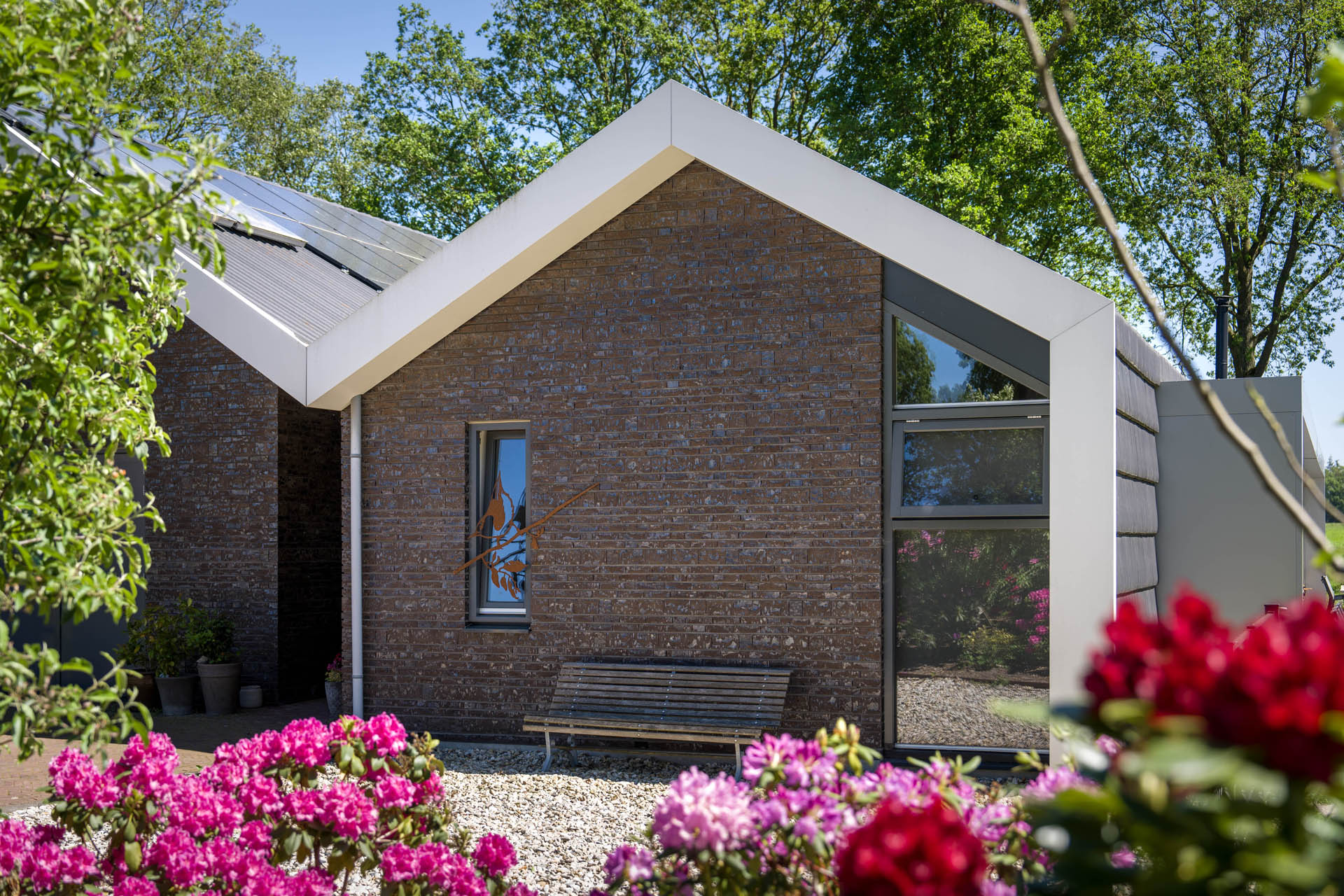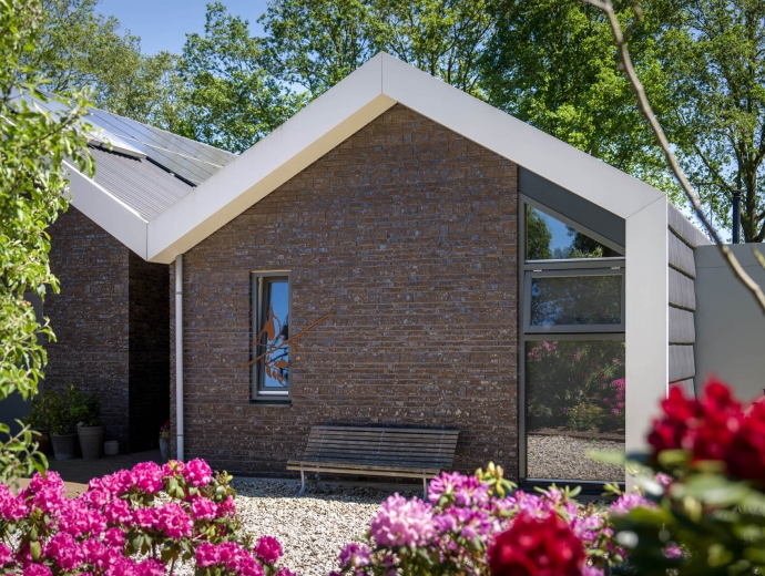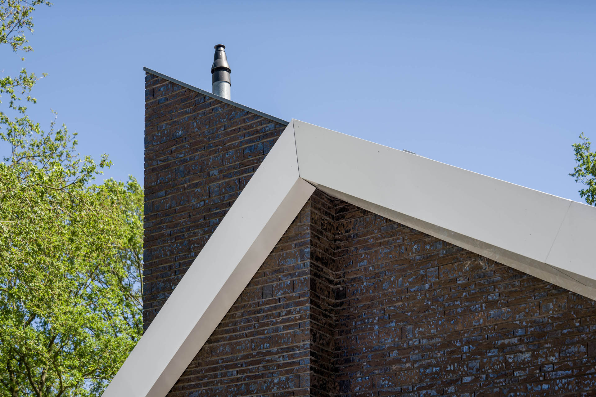 De antraciet vlakke pan geeft het gebouw een rustige landelijke uitstraling. De uit het bestemmingsplan verplichte witte kaders geven het gebouw energie die versterkt wordt door het schoorsteen element. Dichterbij krijgt de voorgevel meer reliëf en wordt het tastbaarder door de ruige antraciet boomschorssteen van Strating, die stootvoegloos gemetseld is in verschillende formaten.