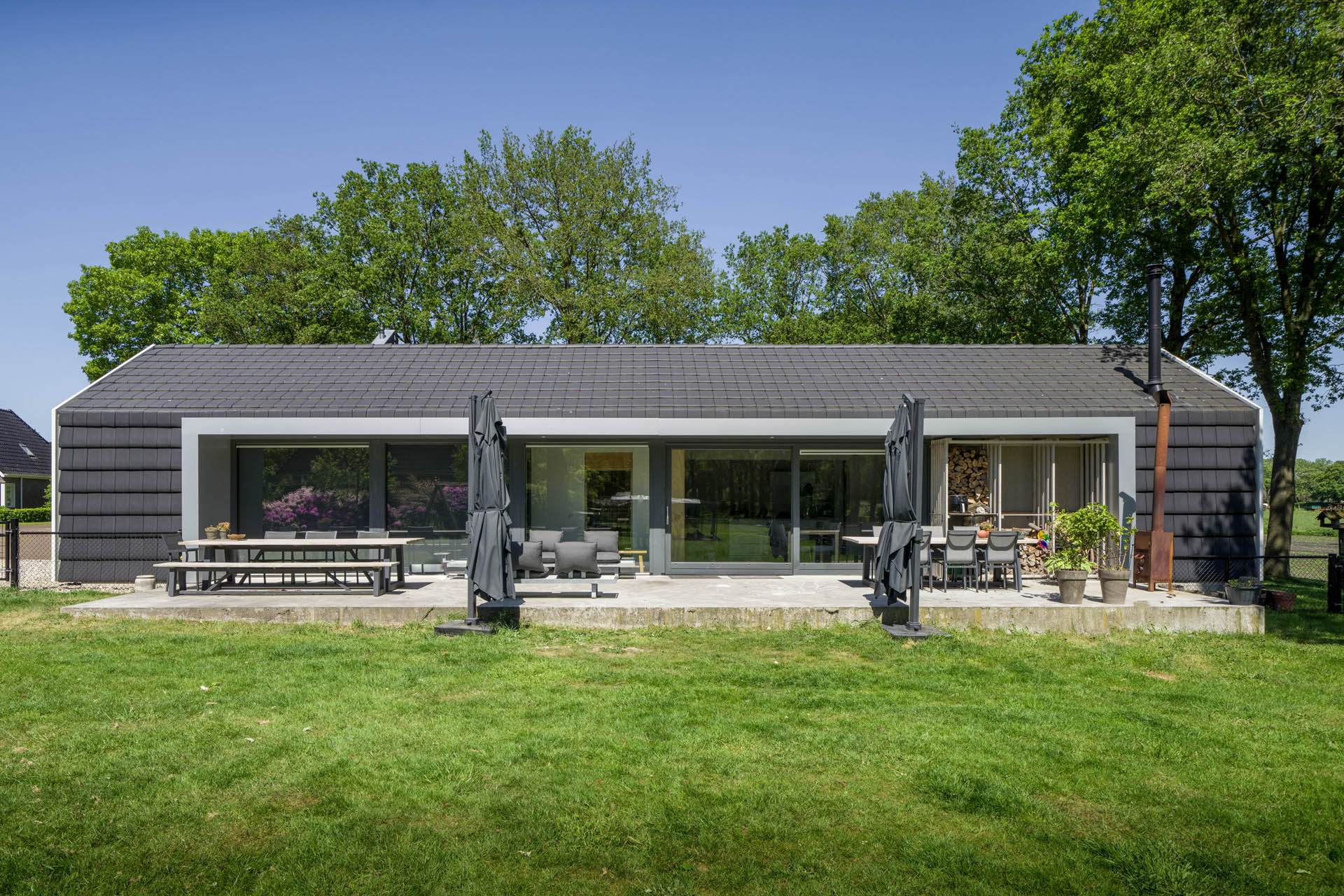 De woning is omgeven door grasland en er is optimaal gebruik gemaakt van het aanwezige hoogteverschil in het terrein. Het grootte betonnen terras is hierdoor een toegevoegde kamer van de woning, waar binnen en buiten in elkaar overlopen.