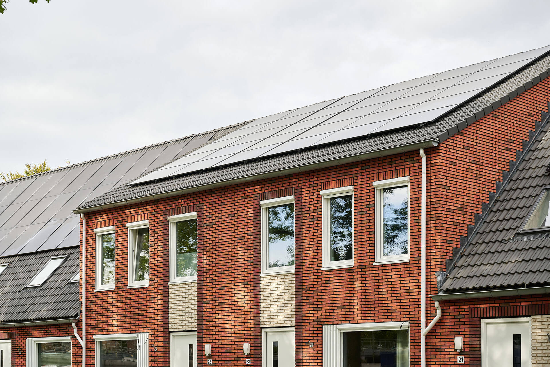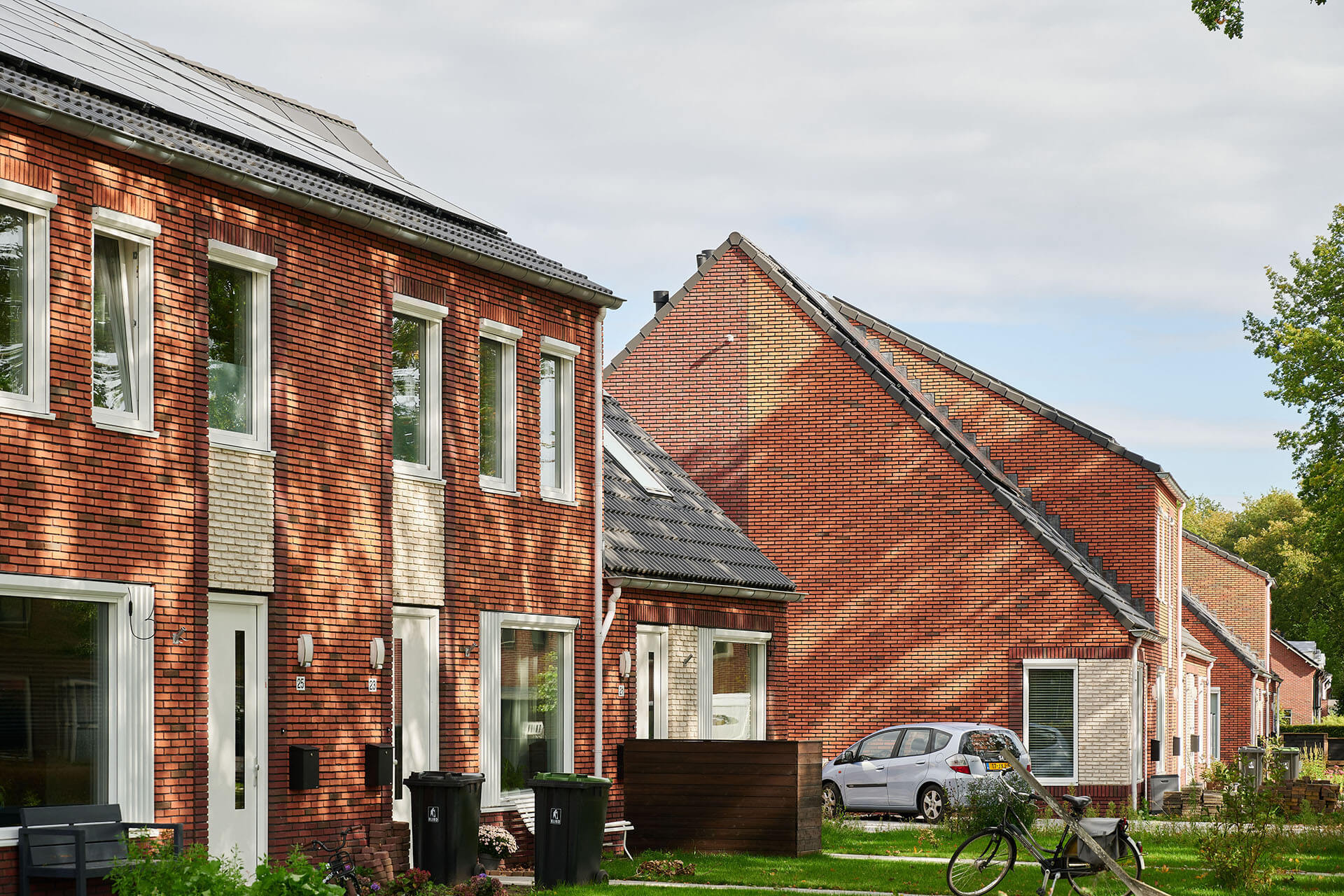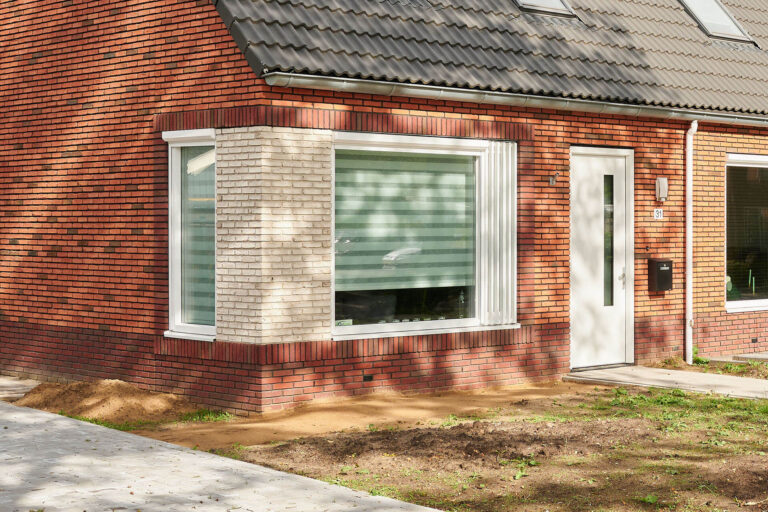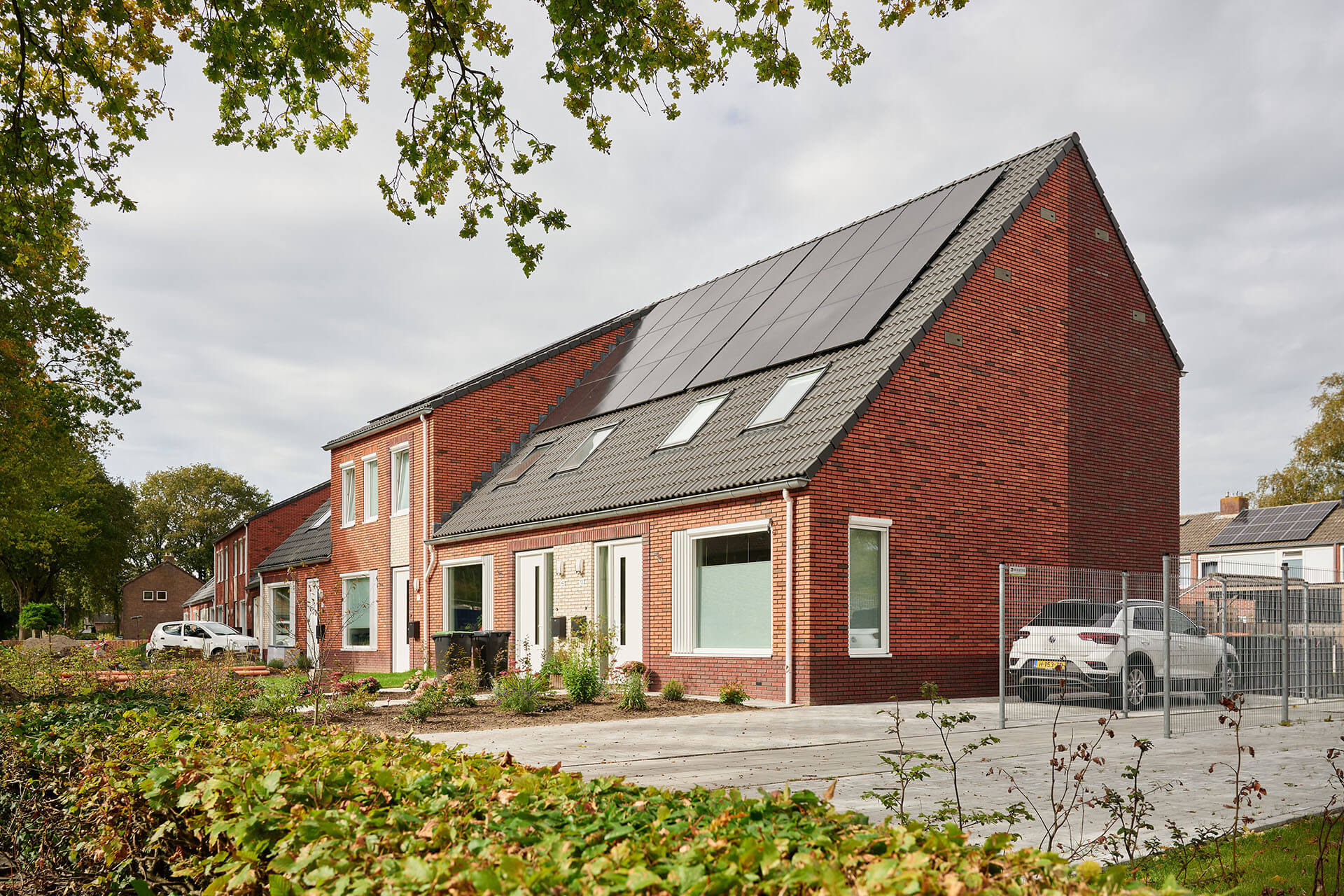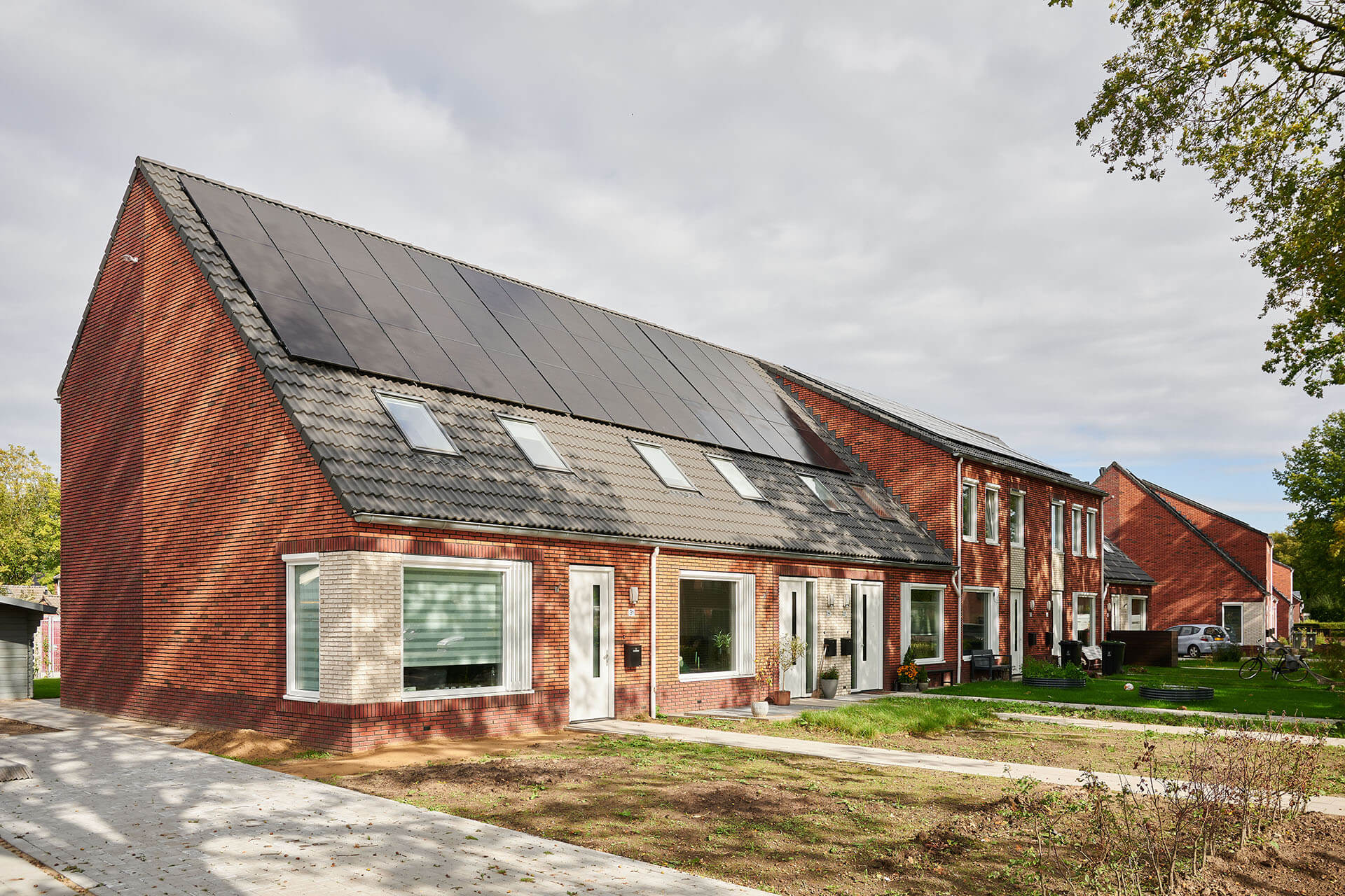 Het ontwerp kenmerkt zich door de asymmetrische kap met een lage goot voor en hoge goot achter, hierdoor ontstaat er meer ruimte in de straat. Met een frisse rood genuanceerde baksteen, accenten in wit en donker metselwerk en wisselende kleur dakpan is er wijkvernieuwing doorgevoerd met oog voor karakter.