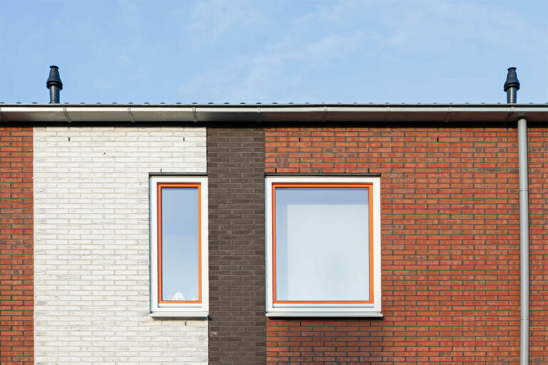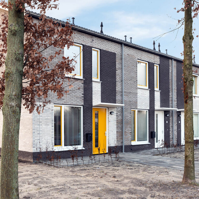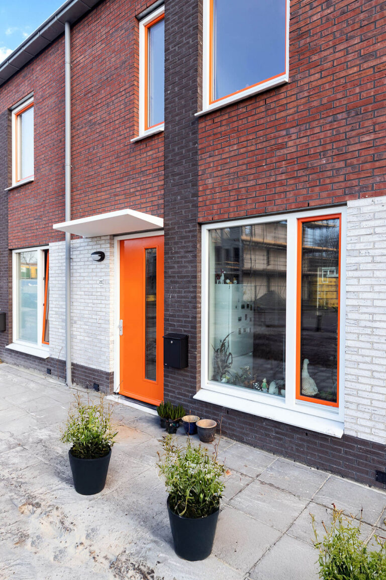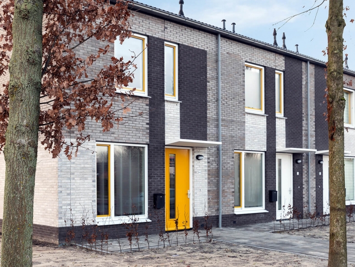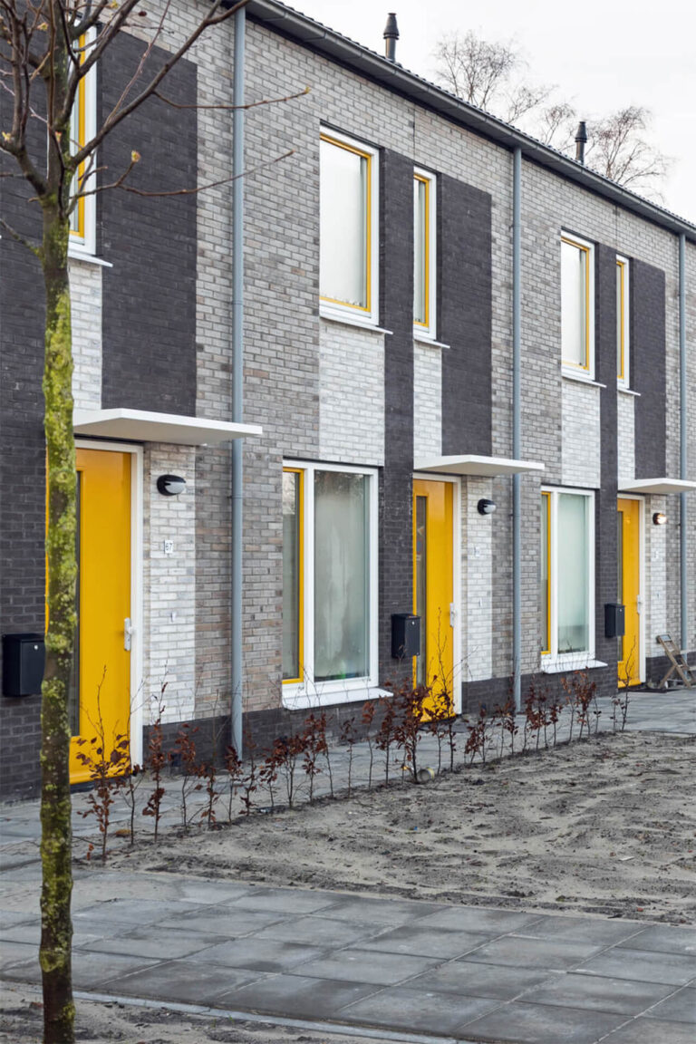 De woningen zijn zeker niet standaard. De woningen zelf zijn smal en hebben de keuken aan de voorkant. Er is gekozen voor een groot kozijn met een lage vensterbank aan de voorzijde. Vaak zie je hier een kozijn met een hoge vensterbank, de woning ligt dan opgesloten achter de gevel. Nu hebben de bewoners een grote vensterbank waar ze op kunnen zitten. Dat geeft de keuken meer ruimtelijke kwaliteit. Ook is er veel aandacht besteed aan de voortuintjes, met aan de voorkant een lage heg.