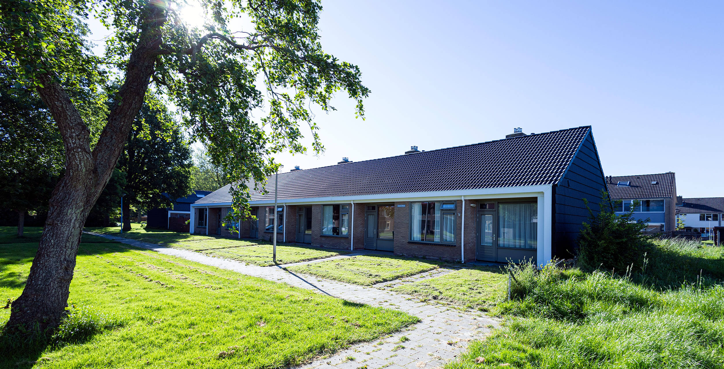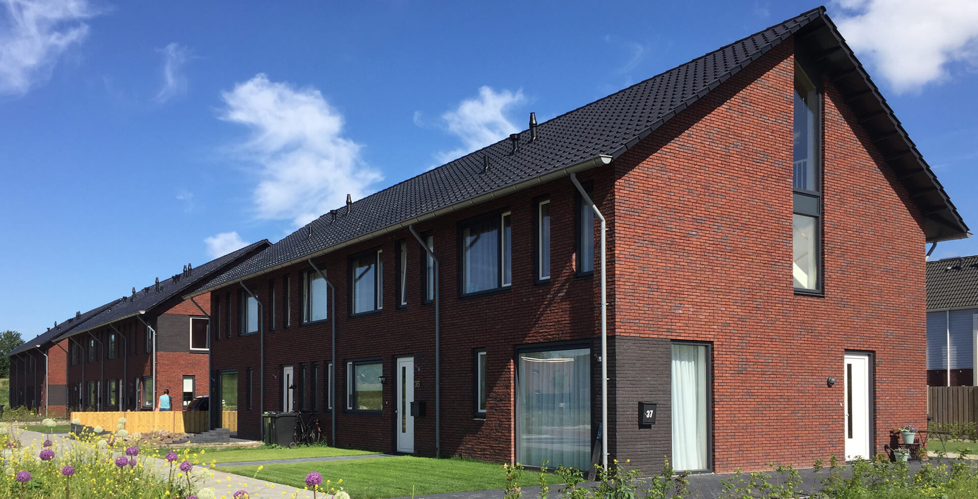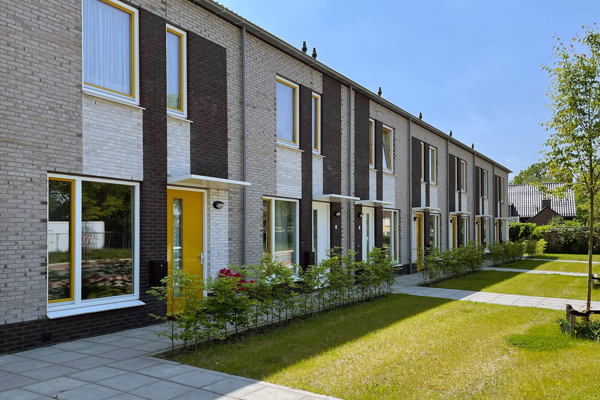 De woningen zijn zeker niet standaard. De woningen zelf zijn smal en hebben de keuken aan de voorkant. Er is gekozen voor een groot kozijn met een lage vensterbank aan de voorzijde. Vaak zie je hier een kozijn met een hoge vensterbank, de woning ligt dan opgesloten achter de gevel. Nu hebben de bewoners een grote vensterbank waar ze op kunnen zitten. Dat geeft de keuken meer ruimtelijke kwaliteit. Ook is er veel aandacht besteed aan de voortuintjes, met aan de voorkant een lage heg.