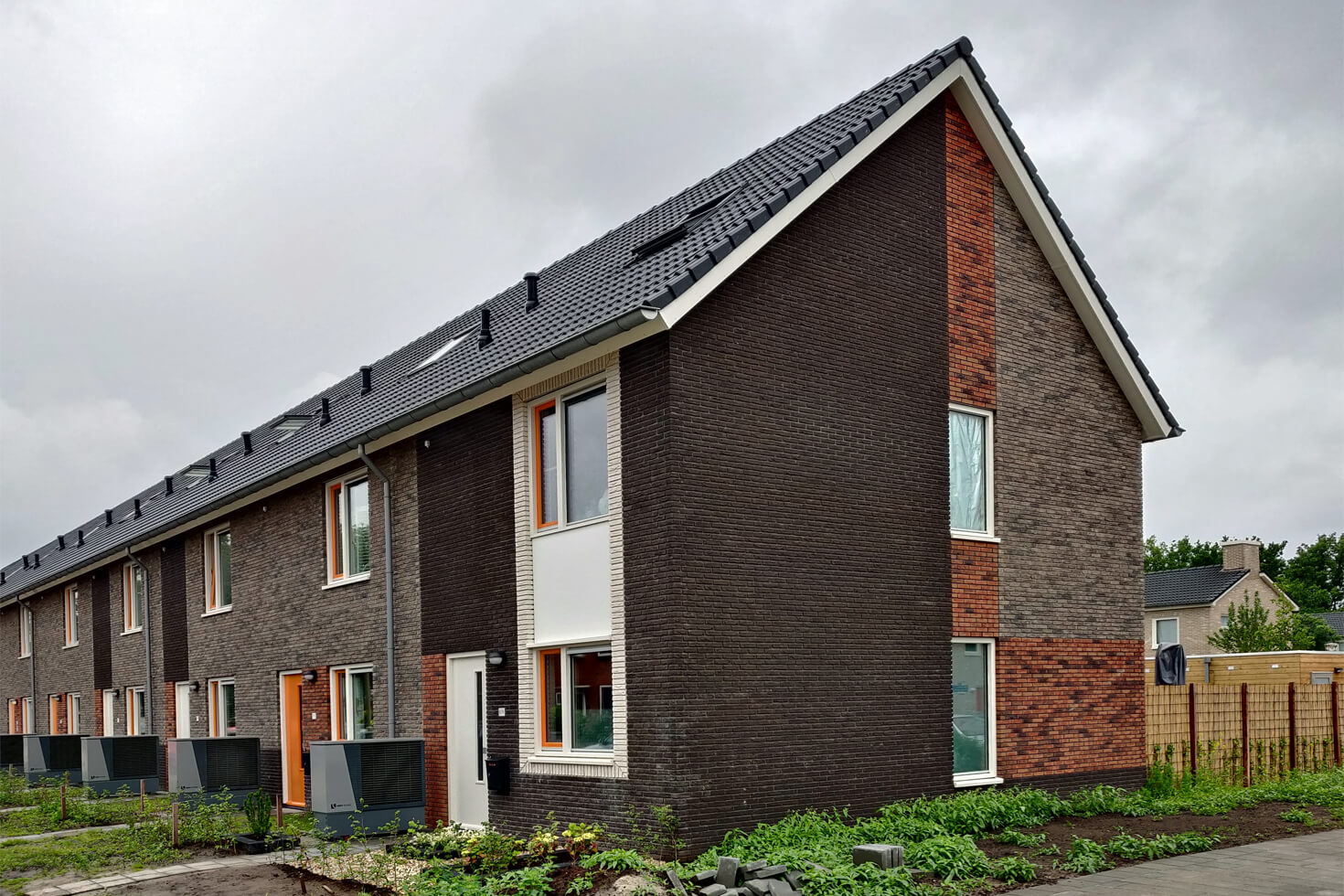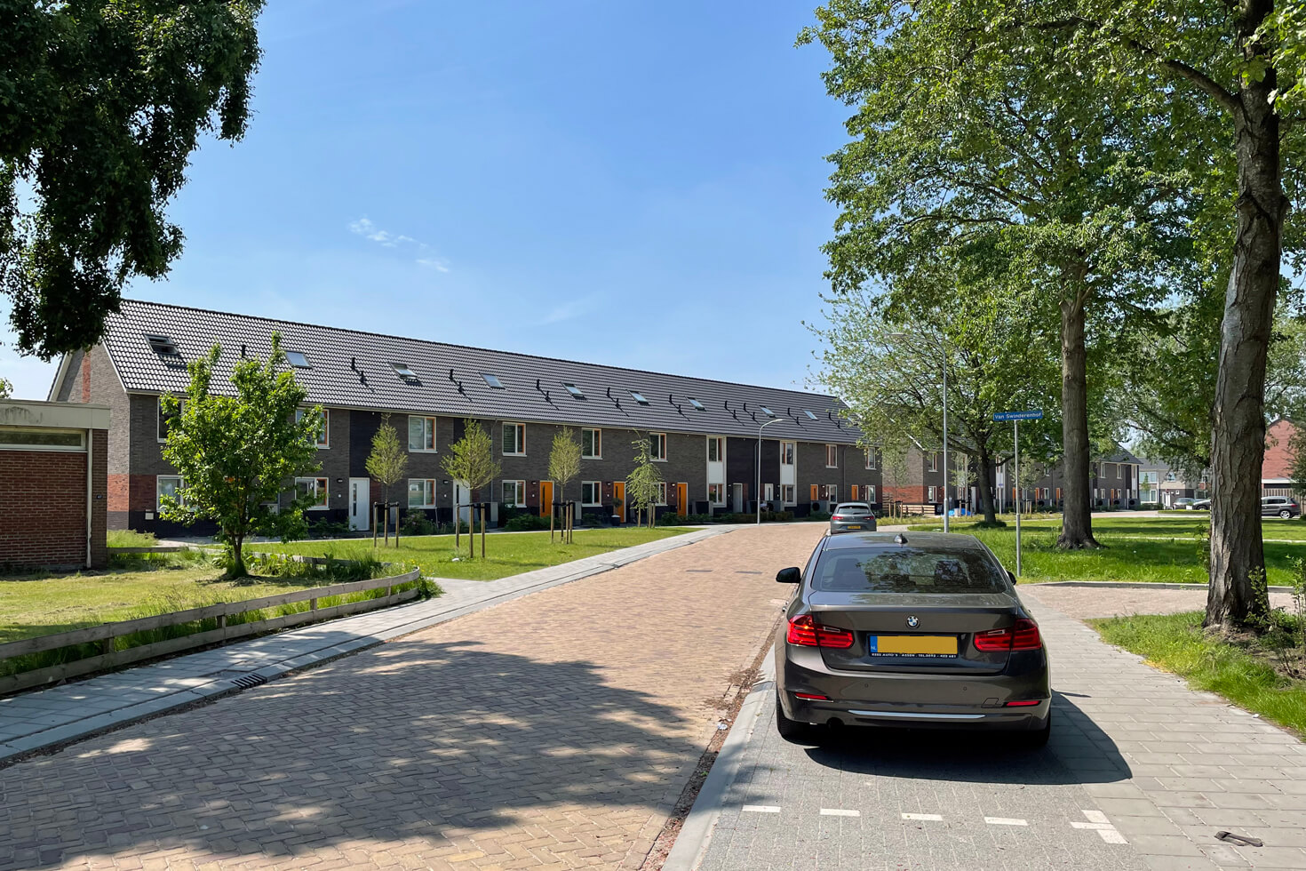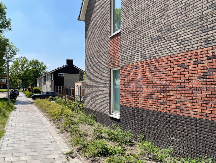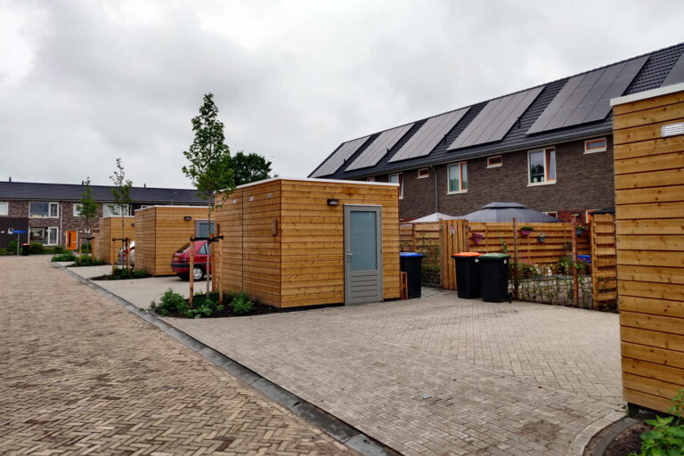 Achter in de tuin is ruimte voor een privé berging en een eigen parkeerplaats in het groen. Hier is voor gekozen om zoveel mogelijk het parkeren van de straat te krijgen.