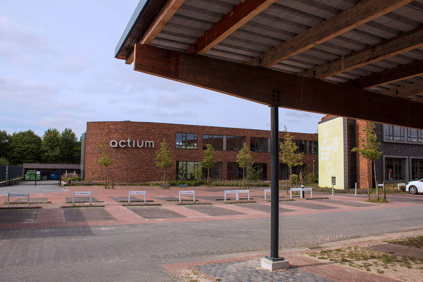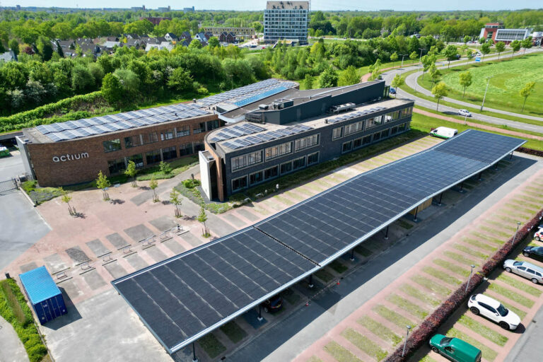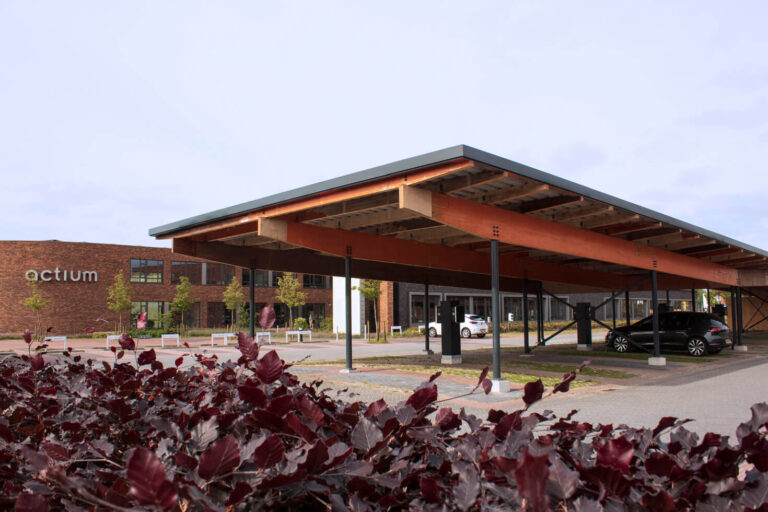 Actium Wonen wil medewerkers en bezoekers stimuleren over te stappen op elektrisch rijden. Hiervoor is een gevleugeld dakvlak ontworpen voorzien van 450 zonnepanelen, waardoor auto’s CO2 neutraal opgeladen kunnen worden.