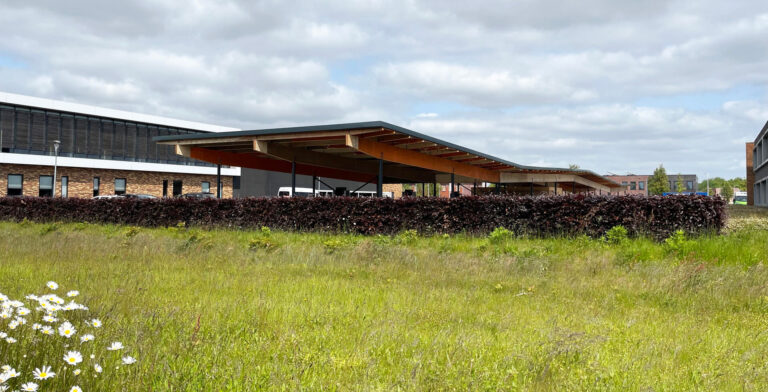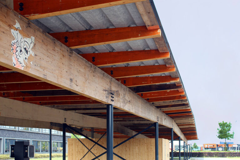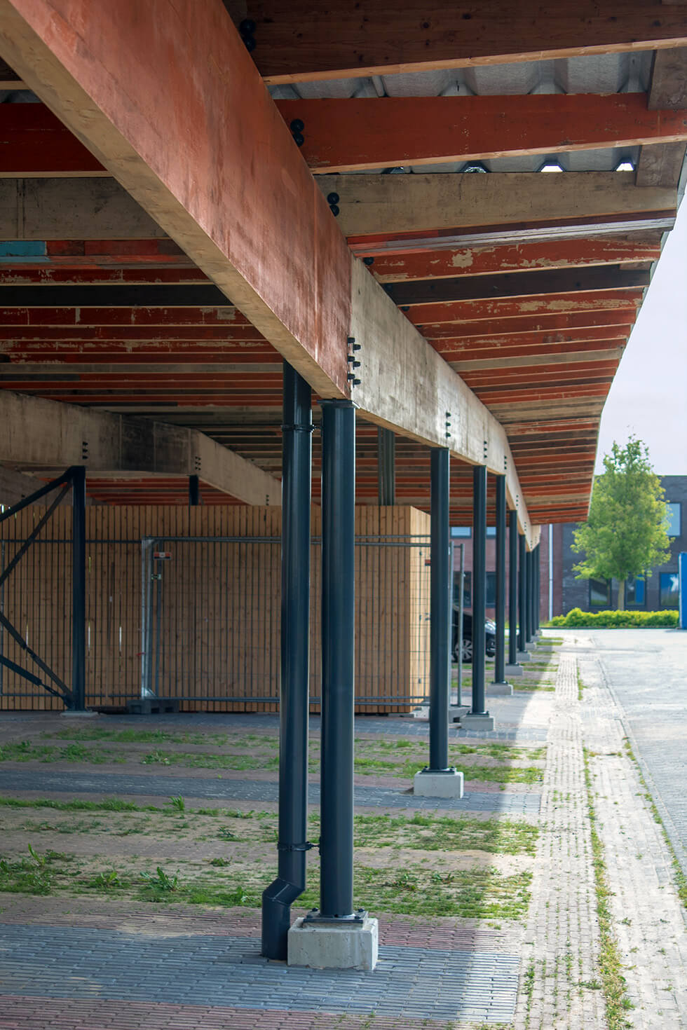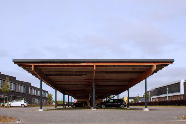 Door te ontwerpen met hergebruikte houten spanten wordt de CO2 voetafdruk van de zonnecarport verder teruggebracht. Het toepassen van circulaire materialen was een van de wensen van Actium. Maar dragende constructies uit hergebruikte materialen maken bleek een hele uitdaging. De massieve gelamineerde liggers en het ritme van de houten sporen versterken het gevleugelde karakter van het dak. In combinatie met de slanke stalen kolommen lijkt de zonnecarport te zweven boven de geparkeerde auto’s.