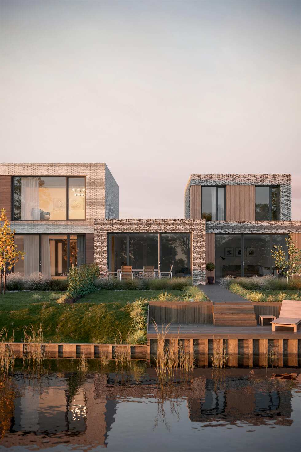 De moderne strakke gevels vormen een chique geheel op de kade, maar krijgen allemaal een eigen karakter door afwisselende kleuren van materialen. De basiswoning is volledig gelijkvloers en is uit te breiden met een aantal uitbouwen, ook is het mogelijk om te kiezen voor een dakopbouw. Door deze vele mee ontworpen opties ontstaat er een mooi gevarieerd beeld. Wat er ook voor uitbouwen of opbouwen gekozen wordt alle voorzieningen zijn op de begane grond te vinden, zodat het huis helemaal klaar is voor de oude dag.