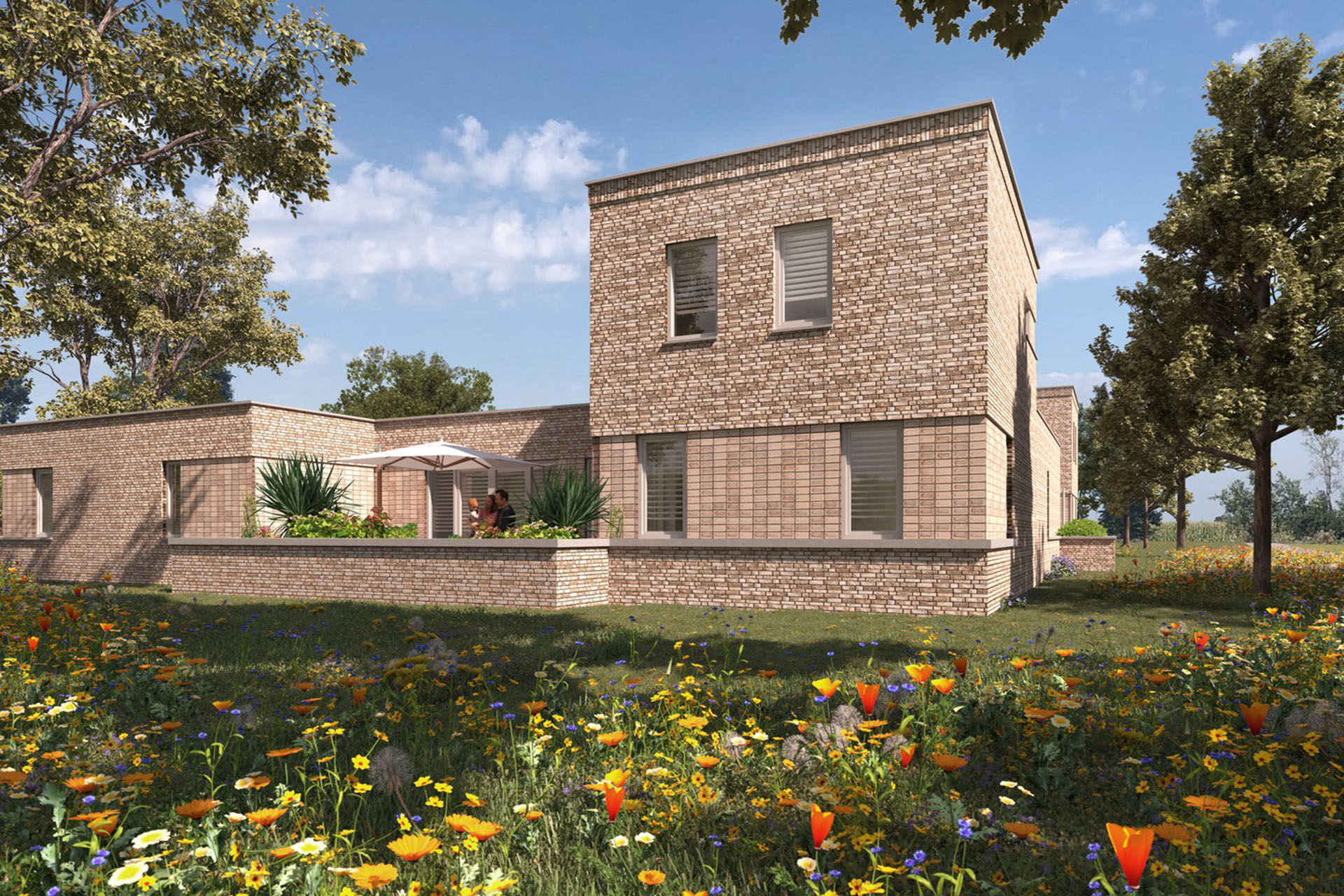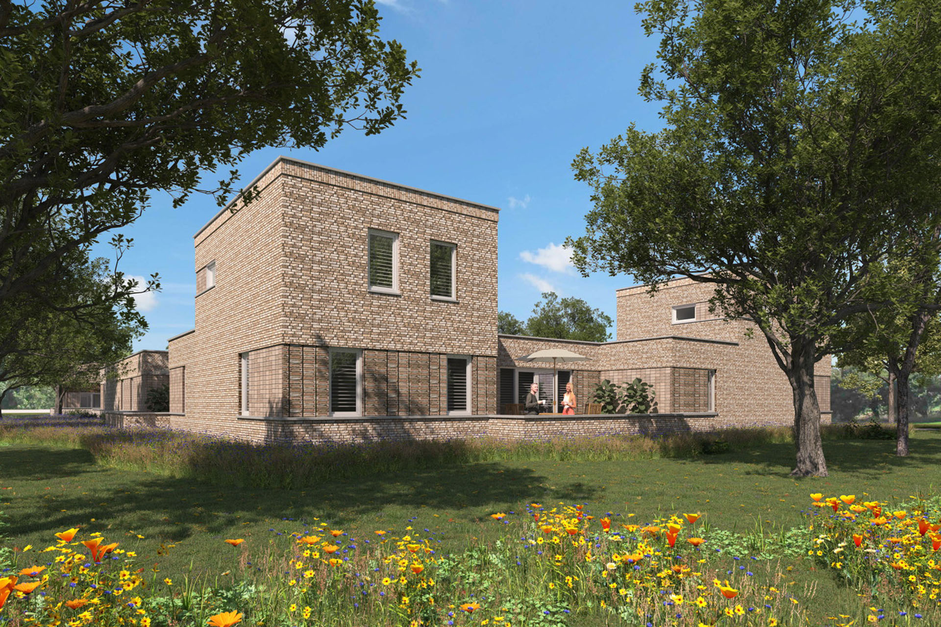De afwisseling van één- en tweelaagse volumes zorgt voor een levendig straatbeeld, terwijl elke woning rust, privacy en een sterke relatie met het omliggende landschap beidt. De robuuste uitstraling, de industriële ondertoon en de sterke collectieve identiteit geven de clusters hun karakter. De bakstenen tuinmuren vormen het dragende element: ze omsluiten de woningen, brengen structuur en ritme, en zorgen voor samenhang. Niet de woning, maar het cluster als geheel bepaalt de ruimtelijke beleving.
